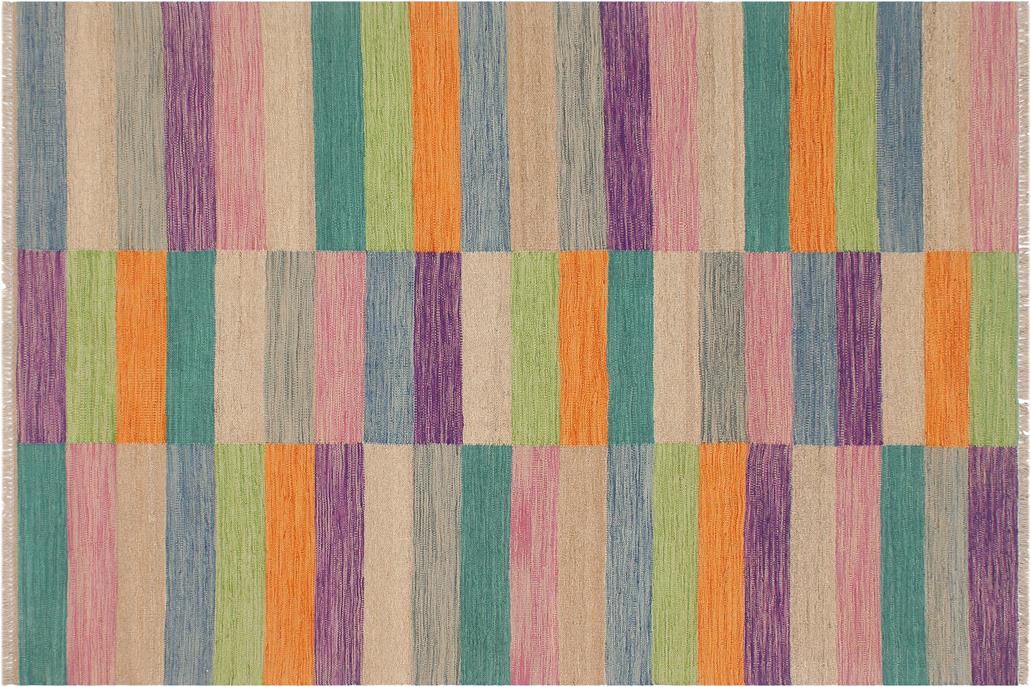 Elevate the elegance of your home with this stunning hand-woven tribal Kilim wool rug. Meticulously crafted on a loom by the Nomad Turkman people using hand-spun wool and 100% natural vegetable dyes, these rugs are recognized for their repetitive geometric patterns, incorporating naturalistic floral and traditional designs. The contemporary fashion palette results in bold, sharp patterns that are incredibly versatile, as the pattern is the same on both sides. These reversible rugs feature a lighter shade on one side and brighter colors on the other, providing versatility according to preference. These unique rugs are made by knotting short strands of different colors onto the warps and securing them by tightly pressing the wefts. The designs are created by interweaving the various colored wefts and warps. Kilims are known for their exceptional durability and versatility, making them truly unique rugs.