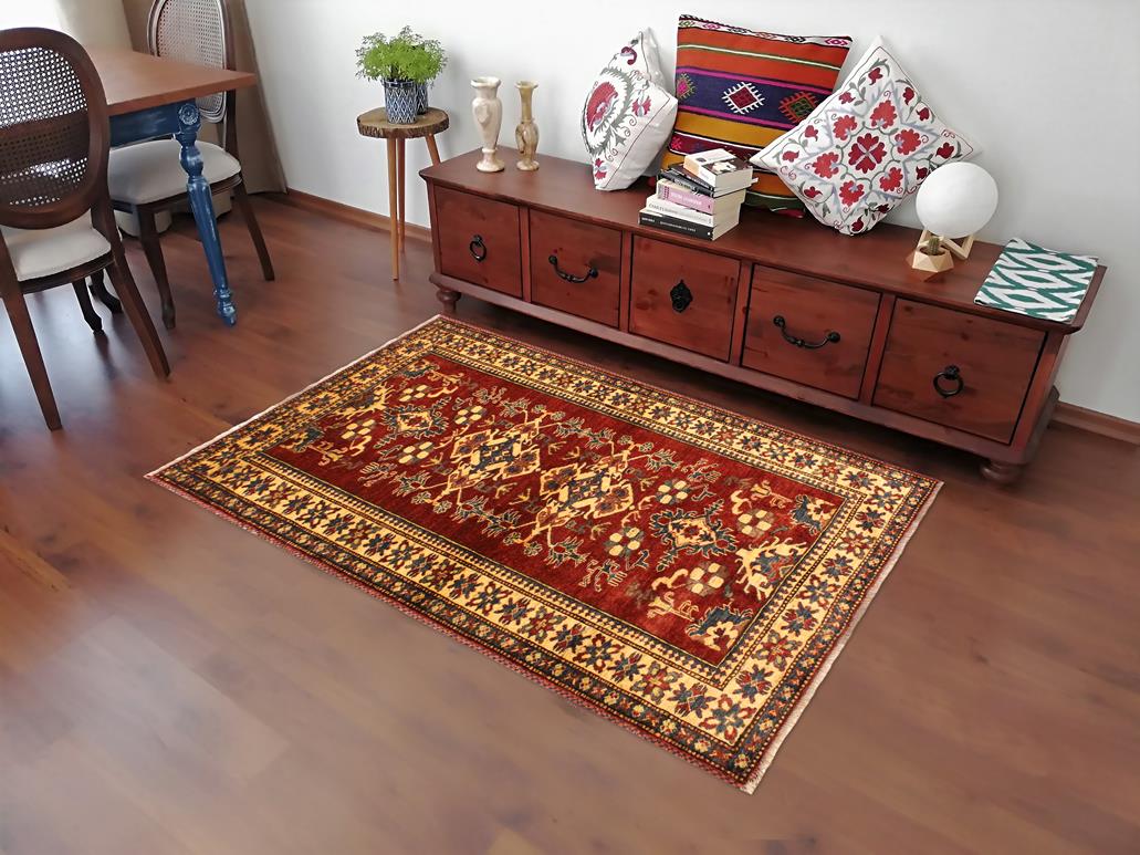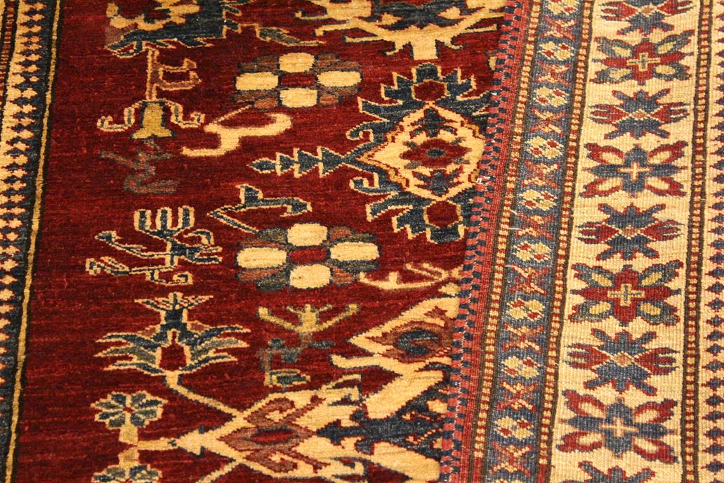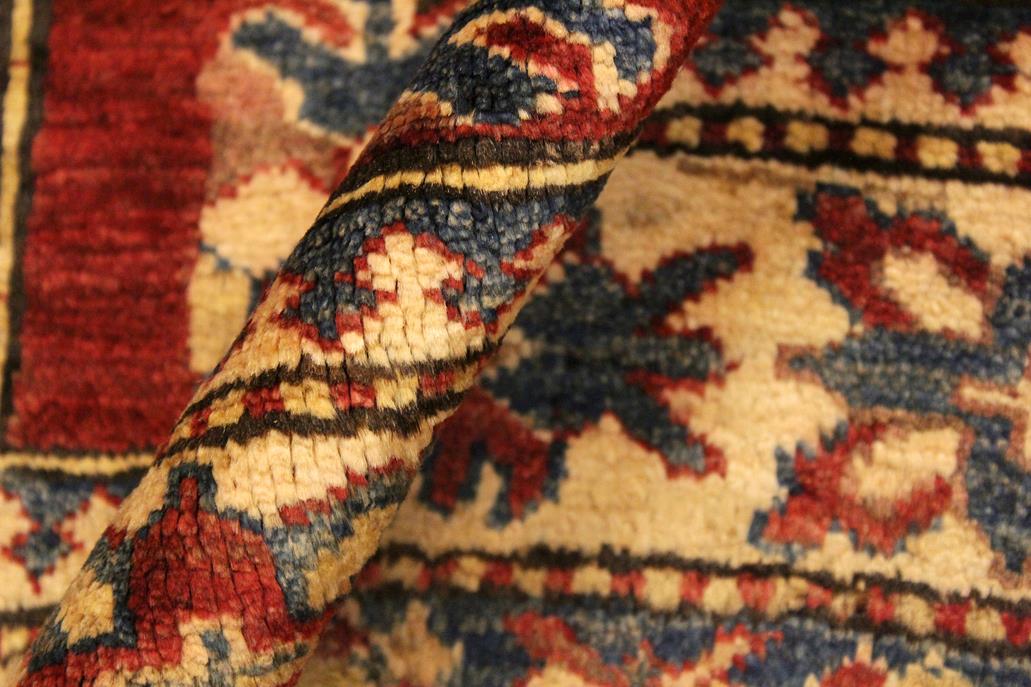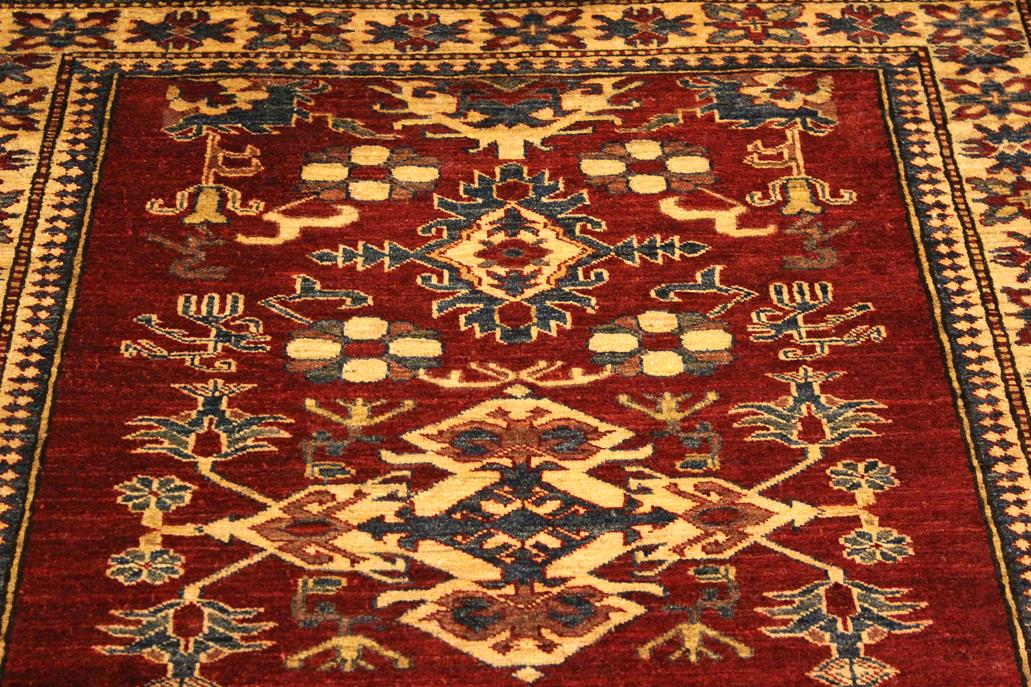 Enhance your home with this exquisite hand-knotted Super Kazak rug, crafted from fine hand-spun wool and dyed with all-natural vegetable dyes. This masterpiece features intricate Super Kazak patterns in a classic color palette, showcasing bold tones and geometric designs. Originating from the Caucasian regions of Russia and northern Persia, each Super Kazak rug reflects a unique tribal style, incorporating stepped polygons, medallions, images of animals, and rosettes. The soft, luxurious pile and vibrant color palette of blues, reds, greens, and gold make it an ideal choice for high-traffic areas, combining durability and beauty. With their geometric and curvilinear designs, Super Kazak rugs have a rich history dating back centuries to the Super Kazakhstan region. These handmade rugs use Turkish knots and natural dyes, resulting in a short pile with an antique finish. Their stunning patterns and colors make them versatile to complement both traditional and modern decor.