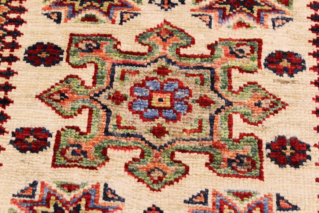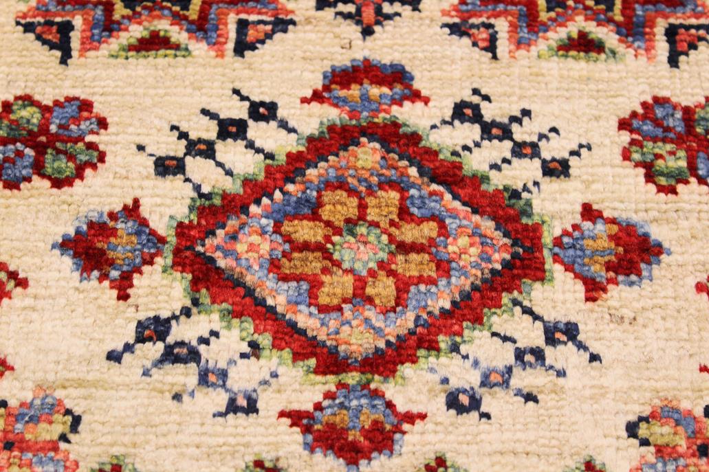 Enhance your home with this exquisite hand-knotted Super Kazak rug, crafted from fine hand-spun wool and dyed with all-natural vegetable dyes. This masterpiece features intricate Super Kazak patterns in a classic color palette, showcasing bold tones and geometric designs. Originating from the Caucasian regions of Russia and northern Persia, each Super Kazak rug reflects a unique tribal style, incorporating stepped polygons, medallions, images of animals, and rosettes. The soft, luxurious pile and vibrant color palette of blues, reds, greens, and gold make it an ideal choice for high-traffic areas, combining durability and beauty. With their geometric and curvilinear designs, Super Kazak rugs have a rich history dating back centuries to the Super Kazakhstan region. These handmade rugs use Turkish knots and natural dyes, resulting in a short pile with an antique finish. Their stunning patterns and colors make them versatile to complement both traditional and modern decor.