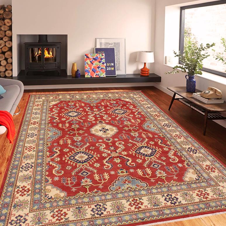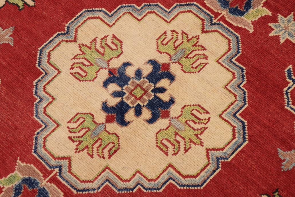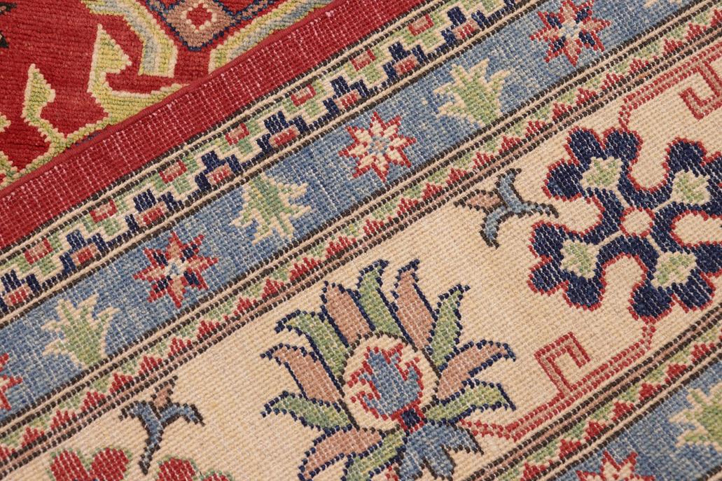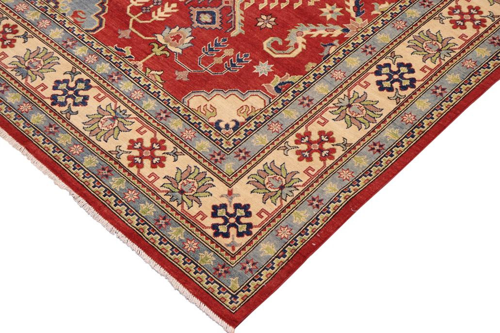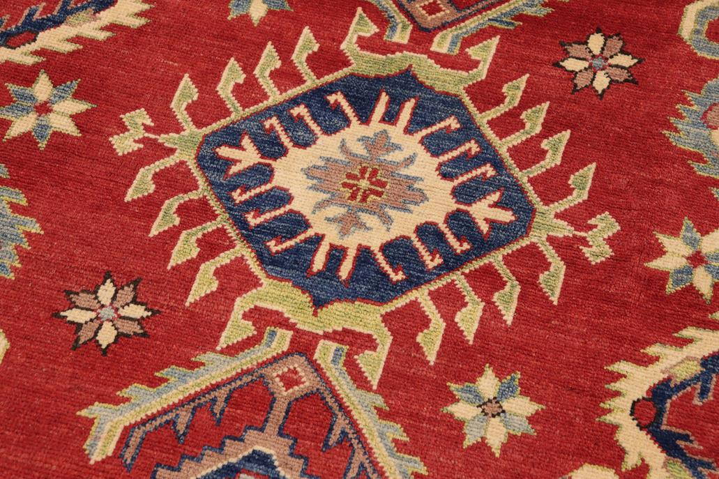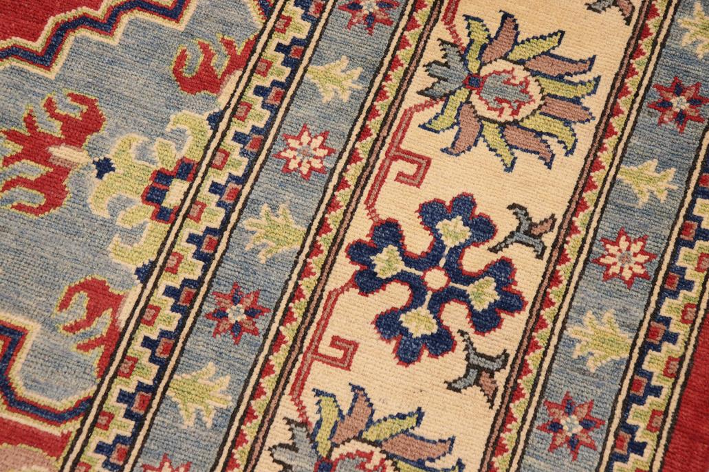 Enhance your home with this exquisite hand-knotted Kazak rug, crafted from fine hand-spun wool and dyed with all-natural vegetable dyes. This masterpiece features intricate Kazak patterns in a classic color palette, showcasing bold tones and geometric designs. Originating from the Caucasian regions of Russia and northern Persia, each Kazak rug reflects a unique tribal style, incorporating stepped polygons, medallions, images of animals, and rosettes. The soft, luxurious pile and vibrant color palette of blues, reds, greens, and gold make it an ideal choice for high-traffic areas, combining durability and beauty. With their geometric and curvilinear designs, Kazak rugs have a rich history dating back centuries to the Kazakhstan region. These handmade rugs use Turkish knots and natural dyes, resulting in a short pile with an antique finish. Their stunning patterns and colors make them versatile to complement both traditional and modern decor.