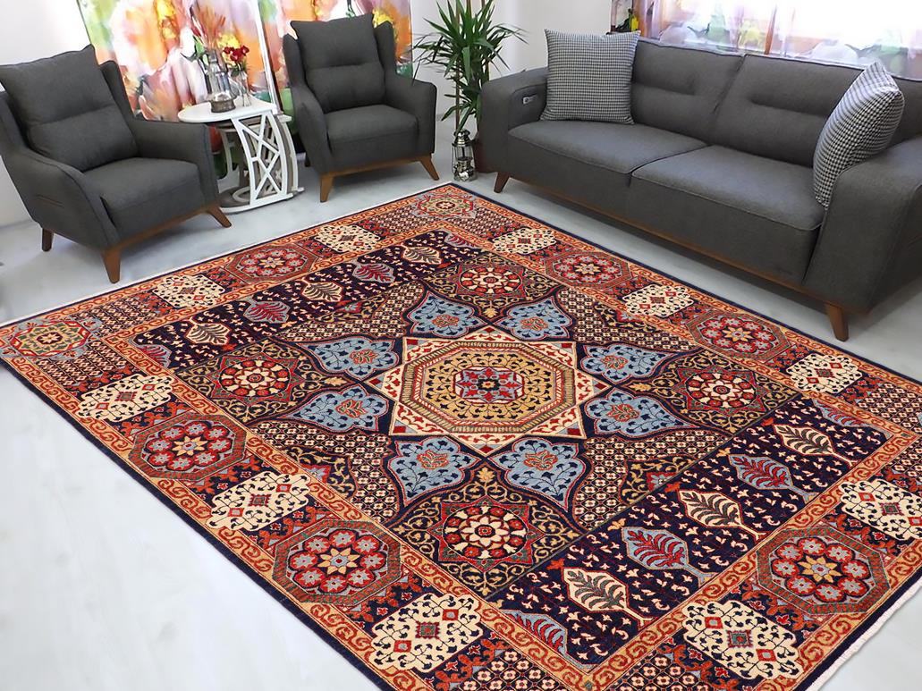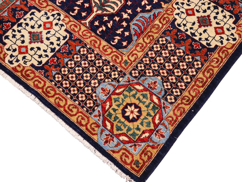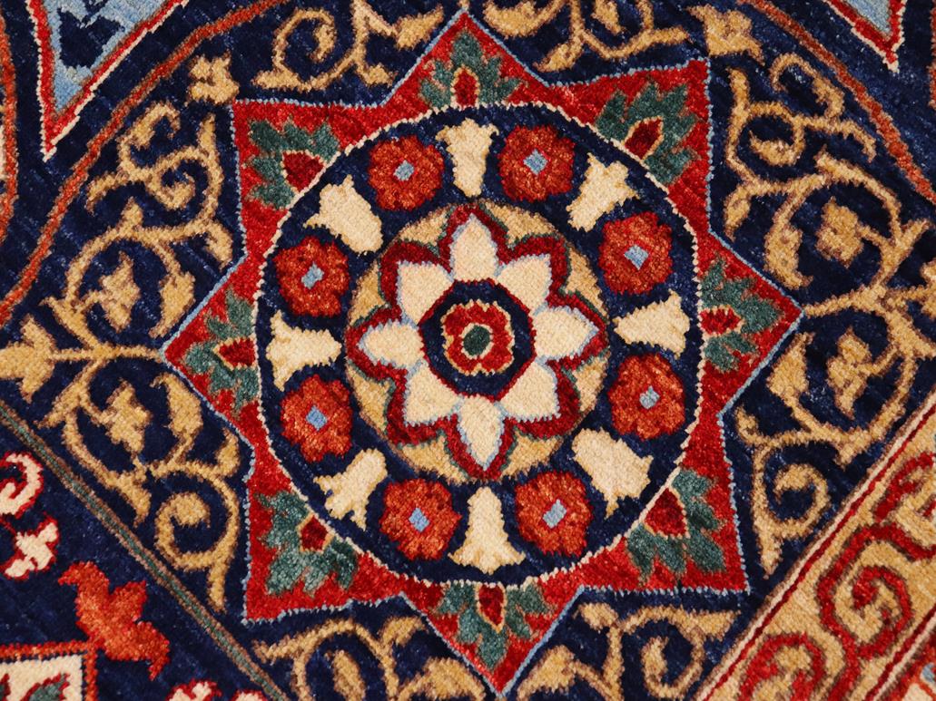 With strict standards of craftsmanship and quality of materials used this magnificent hand-knotted rug features a Mamluk design characterized by their unique weave and fine quality wool. Made for the Sultans in the 15th Century, Mamluk hand-knotted rugs devour design and structural characteristics that are based on a unique interplay of geometric forms with beauteous medallions made up of intersecting compartments and subtle layering making it a masterpiece of its own. This magnificent rug made with handspun wool and natural dyes features soft and lustrous, almost silk-like wool which gives it an elegant royal look. The breath-taking color pallet with an intricate geometric Mamluk design brings a rich form of cultural art to any decor. The unique hand-knotted rug narrates an archival story of the Mamluk Sultans and the Ottoman Empire bringing a rich sense of history, elegance, and sophistication in any decor.