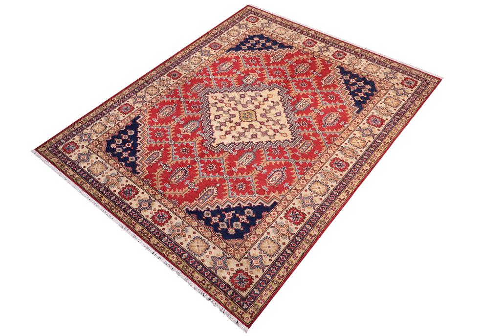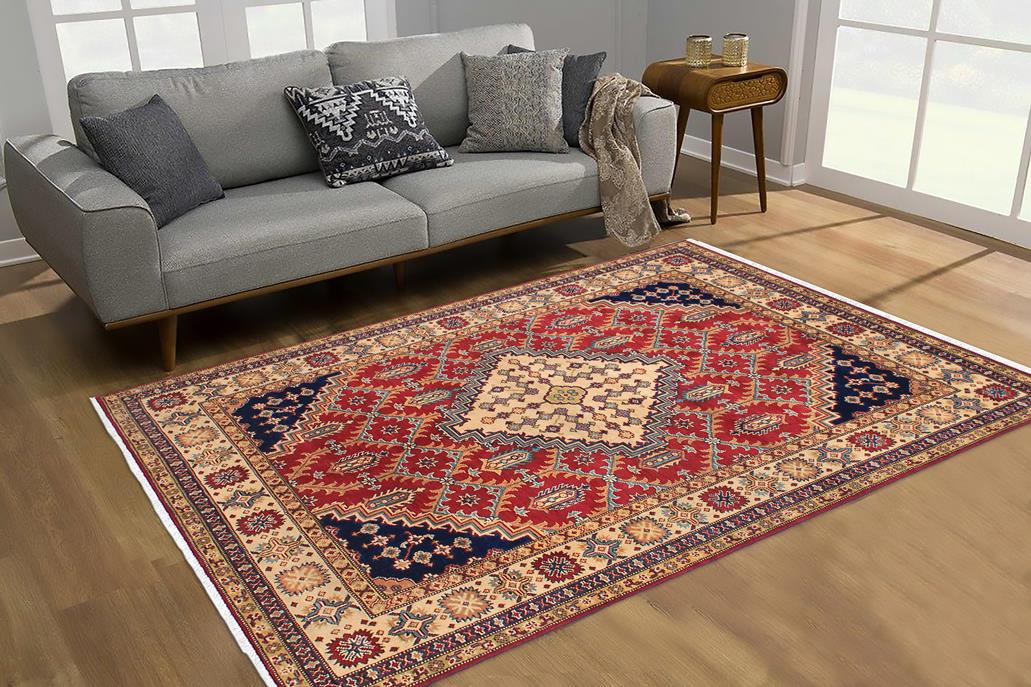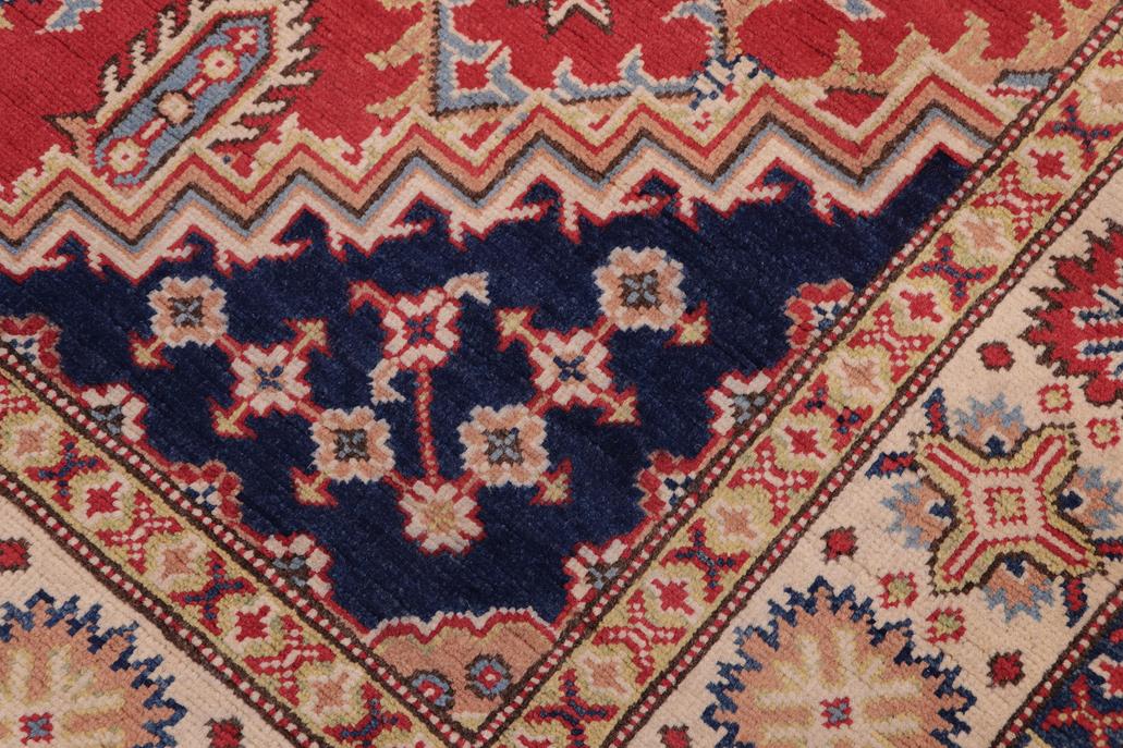 Enhance your home with this exquisite hand-knotted Kazak rug, crafted from fine hand-spun wool and dyed with all-natural vegetable dyes. This masterpiece features intricate Kazak patterns in a classic color palette, showcasing bold tones and geometric designs. Originating from the Caucasian regions of Russia and northern Persia, each Kazak rug reflects a unique tribal style, incorporating stepped polygons, medallions, images of animals, and rosettes. The soft, luxurious pile and vibrant color palette of blues, reds, greens, and gold make it an ideal choice for high-traffic areas, combining durability and beauty. With their geometric and curvilinear designs, Kazak rugs have a rich history dating back centuries to the Kazakhstan region. These handmade rugs use Turkish knots and natural dyes, resulting in a short pile with an antique finish. Their stunning patterns and colors make them versatile to complement both traditional and modern decor.
