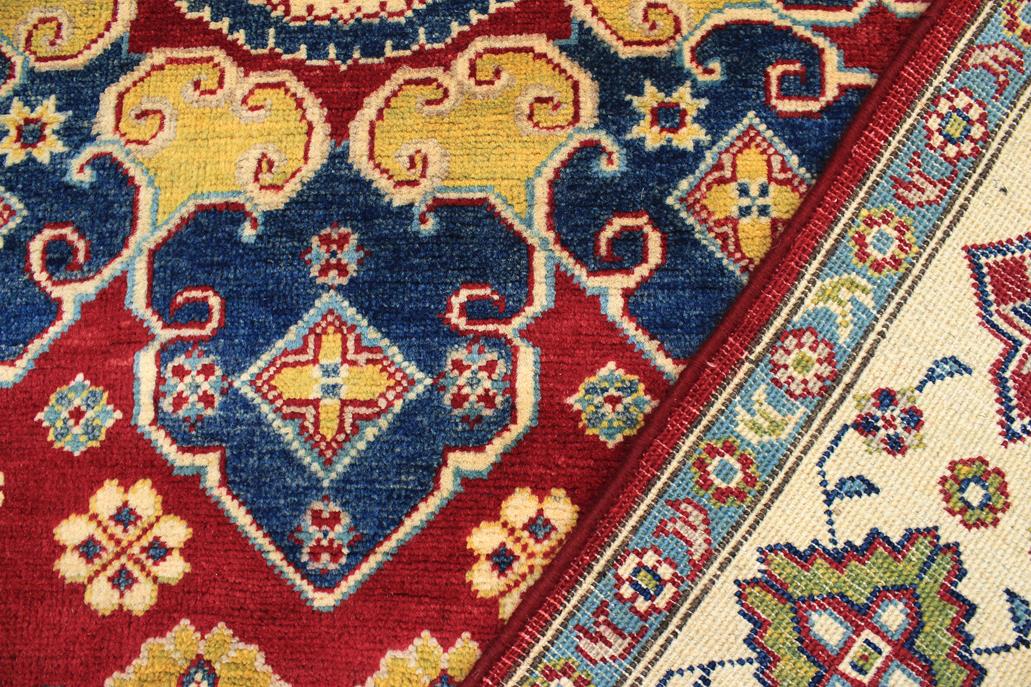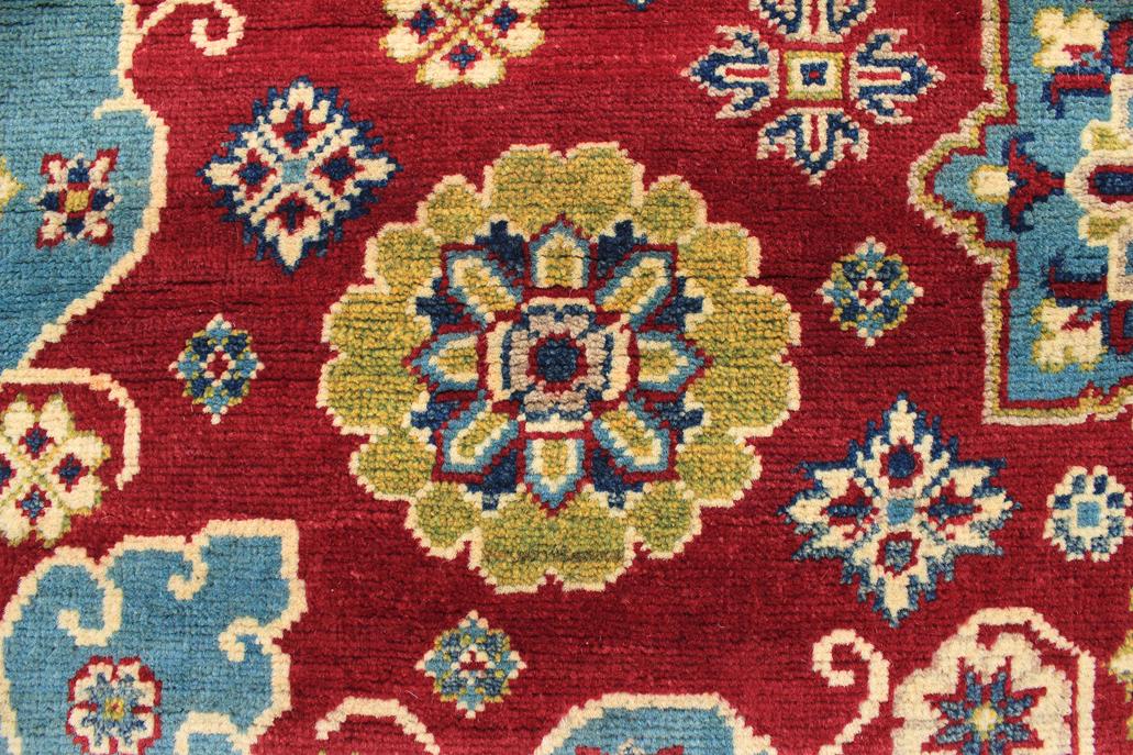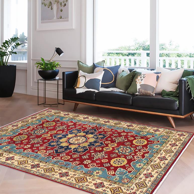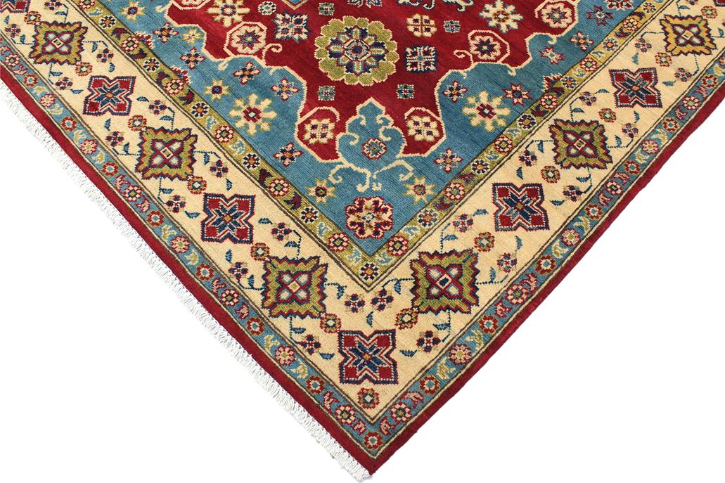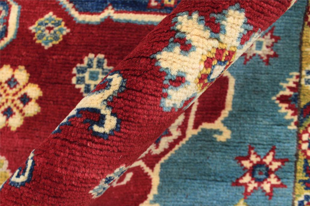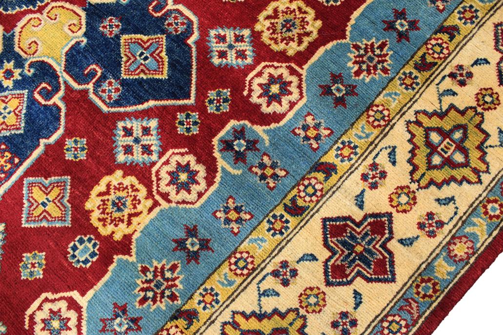 Enhance your home with this exquisite hand-knotted Kazak rug, crafted from fine hand-spun wool and dyed with all-natural vegetable dyes. This masterpiece features intricate Kazak patterns in a classic color palette, showcasing bold tones and geometric designs. Originating from the Caucasian regions of Russia and northern Persia, each Kazak rug reflects a unique tribal style, incorporating stepped polygons, medallions, images of animals, and rosettes. The soft, luxurious pile and vibrant color palette of blues, reds, greens, and gold make it an ideal choice for high-traffic areas, combining durability and beauty. With their geometric and curvilinear designs, Kazak rugs have a rich history dating back centuries to the Kazakhstan region. These handmade rugs use Turkish knots and natural dyes, resulting in a short pile with an antique finish. Their stunning patterns and colors make them versatile to complement both traditional and modern decor.