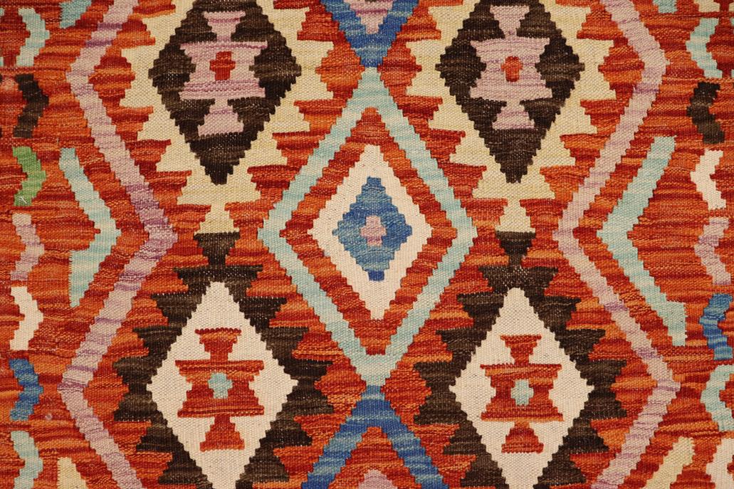 Elevate the elegance of your home with this stunning hand-woven tribal Kilim wool rug. Meticulously crafted on a loom by the Nomad Turkman people using hand-spun wool and 100% natural vegetable dyes, these rugs are recognized for their repetitive geometric patterns, incorporating naturalistic floral and traditional designs. The contemporary fashion palette results in bold, sharp patterns that are incredibly versatile, as the pattern is the same on both sides. These reversible rugs feature a lighter shade on one side and brighter colors on the other, providing versatility according to preference. These unique rugs are made by knotting short strands of different colors onto the warps and securing them by tightly pressing the wefts. The designs are created by interweaving the various colored wefts and warps. Kilims are known for their exceptional durability and versatility, making them truly unique rugs.