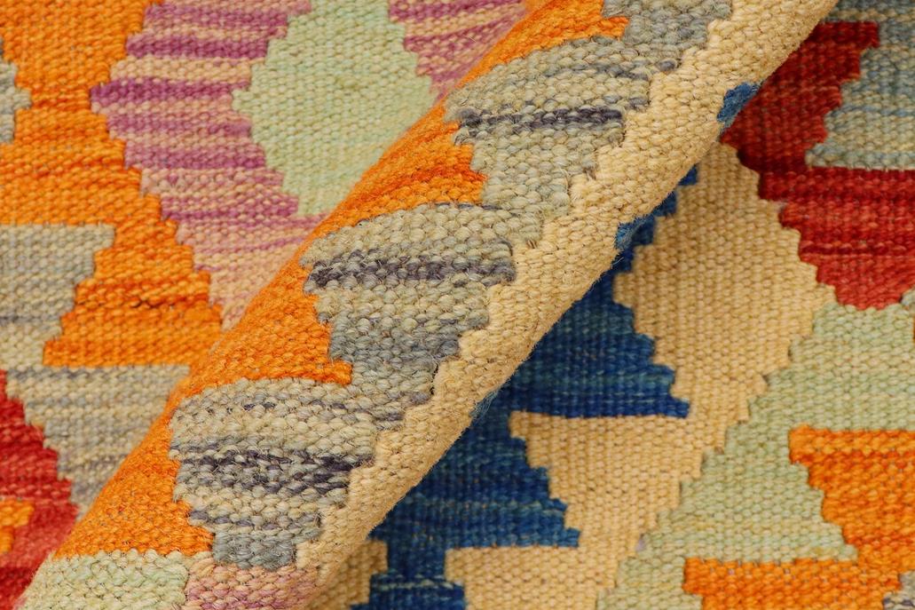 Elevate the elegance of your home with this stunning hand-woven tribal Kilim wool rug. Meticulously crafted on a loom by the Nomad Turkman people using hand-spun wool and 100% natural vegetable dyes, these rugs are recognized for their repetitive geometric patterns, incorporating naturalistic floral and traditional designs. The contemporary fashion palette results in bold, sharp patterns that are incredibly versatile, as the pattern is the same on both sides. These reversible rugs feature a lighter shade on one side and brighter colors on the other, providing versatility according to preference. These unique rugs are made by knotting short strands of different colors onto the warps and securing them by tightly pressing the wefts. The designs are created by interweaving the various colored wefts and warps. Kilims are known for their exceptional durability and versatility, making them truly unique rugs.