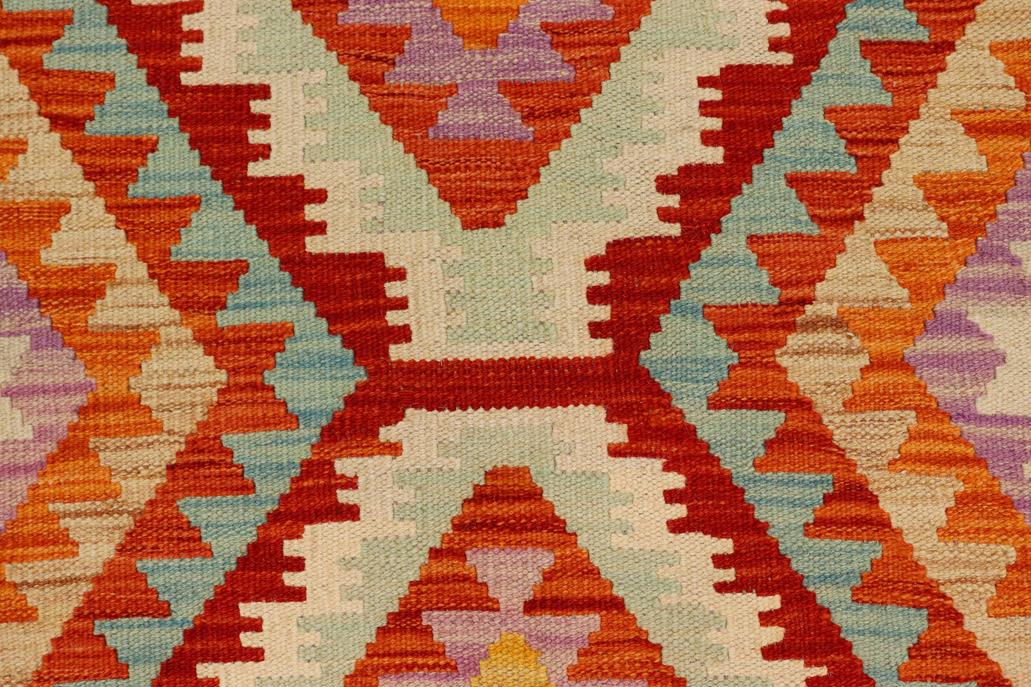 Elevate the elegance of your home with this stunning hand-woven tribal Kilim wool rug. Meticulously crafted on a loom by the Nomad Turkman people using hand-spun wool and 100% natural vegetable dyes, these rugs are recognized for their repetitive geometric patterns, incorporating naturalistic floral and traditional designs. The contemporary fashion palette results in bold, sharp patterns that are incredibly versatile, as the pattern is the same on both sides. These reversible rugs feature a lighter shade on one side and brighter colors on the other, providing versatility according to preference. These unique rugs are made by knotting short strands of different colors onto the warps and securing them by tightly pressing the wefts. The designs are created by interweaving the various colored wefts and warps. Kilims are known for their exceptional durability and versatility, making them truly unique rugs.