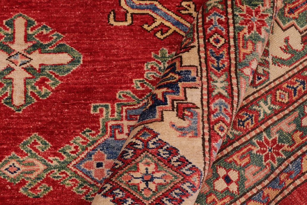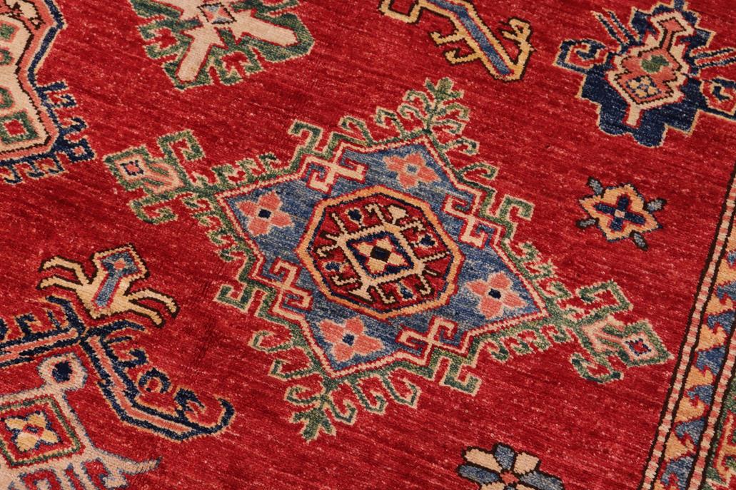 Enhance your home with this exquisite hand-knotted Super Kazak rug, crafted from fine hand-spun wool and dyed with all-natural vegetable dyes. This masterpiece features intricate Super Kazak patterns in a classic color palette, showcasing bold tones and geometric designs. Originating from the Caucasian regions of Russia and northern Persia, each Super Kazak rug reflects a unique tribal style, incorporating stepped polygons, medallions, images of animals, and rosettes. The soft, luxurious pile and vibrant color palette of blues, reds, greens, and gold make it an ideal choice for high-traffic areas, combining durability and beauty. With their geometric and curvilinear designs, Super Kazak rugs have a rich history dating back centuries to the Super Kazakhstan region. These handmade rugs use Turkish knots and natural dyes, resulting in a short pile with an antique finish. Their stunning patterns and colors make them versatile to complement both traditional and modern decor.