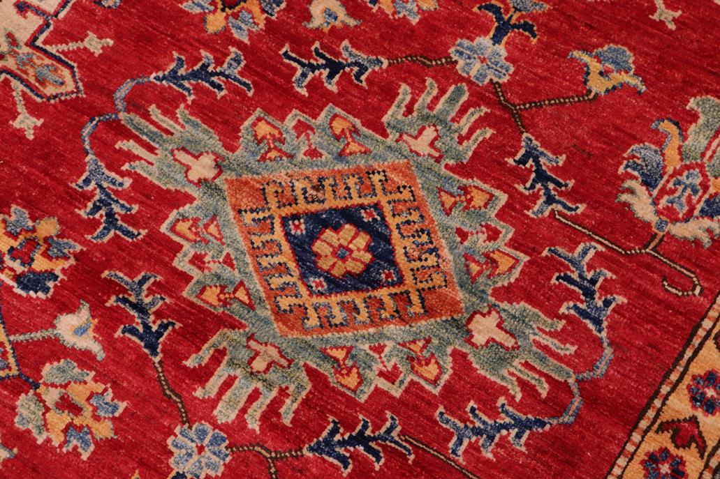 Enhance your home with this exquisite hand-knotted Super Kazak rug, crafted from fine hand-spun wool and dyed with all-natural vegetable dyes. This masterpiece features intricate Super Kazak patterns in a classic color palette, showcasing bold tones and geometric designs. Originating from the Caucasian regions of Russia and northern Persia, each Super Kazak rug reflects a unique tribal style, incorporating stepped polygons, medallions, images of animals, and rosettes. The soft, luxurious pile and vibrant color palette of blues, reds, greens, and gold make it an ideal choice for high-traffic areas, combining durability and beauty. With their geometric and curvilinear designs, Super Kazak rugs have a rich history dating back centuries to the Super Kazakhstan region. These handmade rugs use Turkish knots and natural dyes, resulting in a short pile with an antique finish. Their stunning patterns and colors make them versatile to complement both traditional and modern decor.