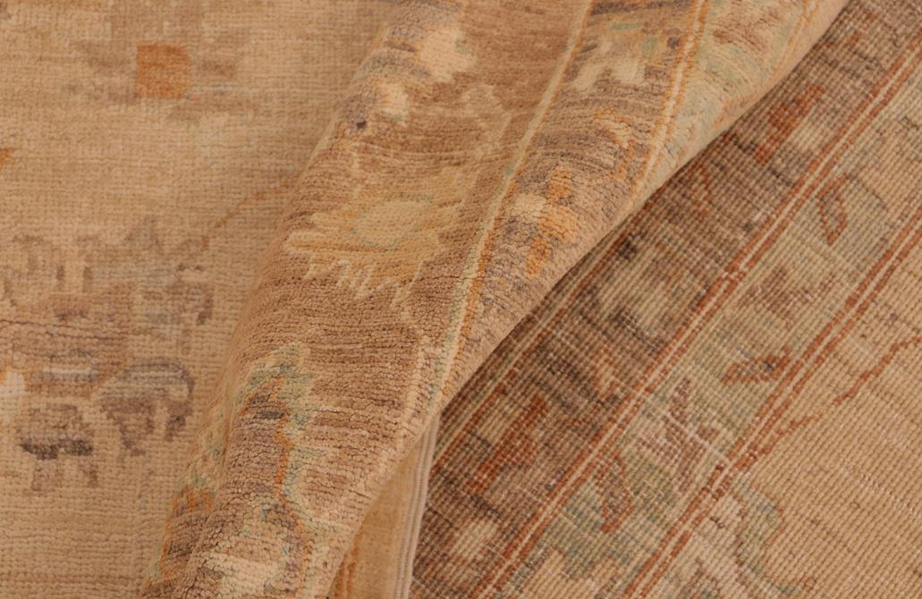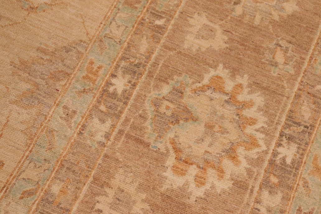 Enhance the ambiance of your home with this magnificent Persian-influenced Turkish hand-knotted rug made by skilled artisans capable of creating the most exceptional vegetable dyes and hand-spun wool. This exquisite handmade rug is a one-of-a-kind Peshawar Kafkaz, otherwise identified as Chobi, Chobi Peshawar, Oushak, or Ziegler rug. These handmade rugs are crafted in Pakistan utilizing superior-quality wool imported from Australia, New Zealand, and Korea in two types of weaves: the Persian weave and the Mori weave. This rug is meticulously crafted by hand using the finest natural vegetable dyes extracted from local plants. The artisans use a blend of hand-spun local and fine merino wool, resulting in a rug with a compelling texture, higher lanolin content, and longer staple. The artisans occasionally incorporate natural or artificial silk into the pile to enhance specific motifs. The finished product is an awe-inspiring execution of flawless design and an understated palette that exudes elegance. Contemporary Peshawar rugs draw inspiration from antique Persian designs and feature modern design motifs with vibrant color tones. Hand-knotted with all-natural dyes, resulting in a unique abrash effect and subtle color variations in the pile. Peshawar rugs are known for their stunning and vibrant colors, achieved through a process inspired by antique methods. The rug's pile is meticulously trimmed to a moderate thickness and then stone-washed and sun-dried, resulting in a natural sheen and pleasing color tones. Transform the ambiance of your room into a luxurious haven with this gorgeous rug featuring a beautiful color palette. This stunning rug features an intricate oriental design that showcases royalty and seamlessly complements any decor. Its hand-knotted construction and natural fibers provide a soft and comfortable feel underfoot, making it the perfect addition to any room.