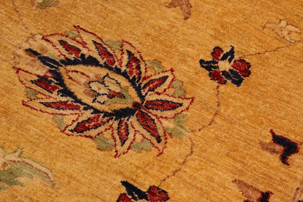 Enhance the ambiance of your home with this magnificent Persian-influenced Turkish hand-knotted rug made by skilled artisans capable of creating the most exceptional vegetable dyes and hand-spun wool. This exquisite handmade rug is a one-of-a-kind Peshawar Kafkaz, otherwise identified as Chobi, Chobi Peshawar, Oushak, or Ziegler rug. These handmade rugs are crafted in Pakistan utilizing superior-quality wool imported from Australia, New Zealand, and Korea in two types of weaves: the Persian weave and the Mori weave. This rug is meticulously crafted by hand using the finest natural vegetable dyes extracted from local plants. The artisans use a blend of hand-spun local and fine merino wool, resulting in a rug with a compelling texture, higher lanolin content, and longer staple. The artisans occasionally incorporate natural or artificial silk into the pile to enhance specific motifs. The finished product is an awe-inspiring execution of flawless design and an understated palette that exudes elegance. Contemporary Peshawar rugs draw inspiration from antique Persian designs and feature modern design motifs with vibrant color tones. Hand-knotted with all-natural dyes, resulting in a unique abrash effect and subtle color variations in the pile. Peshawar rugs are known for their stunning and vibrant colors, achieved through a process inspired by antique methods. The rug's pile is meticulously trimmed to a moderate thickness and then stone-washed and sun-dried, resulting in a natural sheen and pleasing color tones. Transform the ambiance of your room into a luxurious haven with this gorgeous rug featuring a beautiful color palette. This stunning rug features an intricate oriental design that showcases royalty and seamlessly complements any decor. Its hand-knotted construction and natural fibers provide a soft and comfortable feel underfoot, making it the perfect addition to any room.