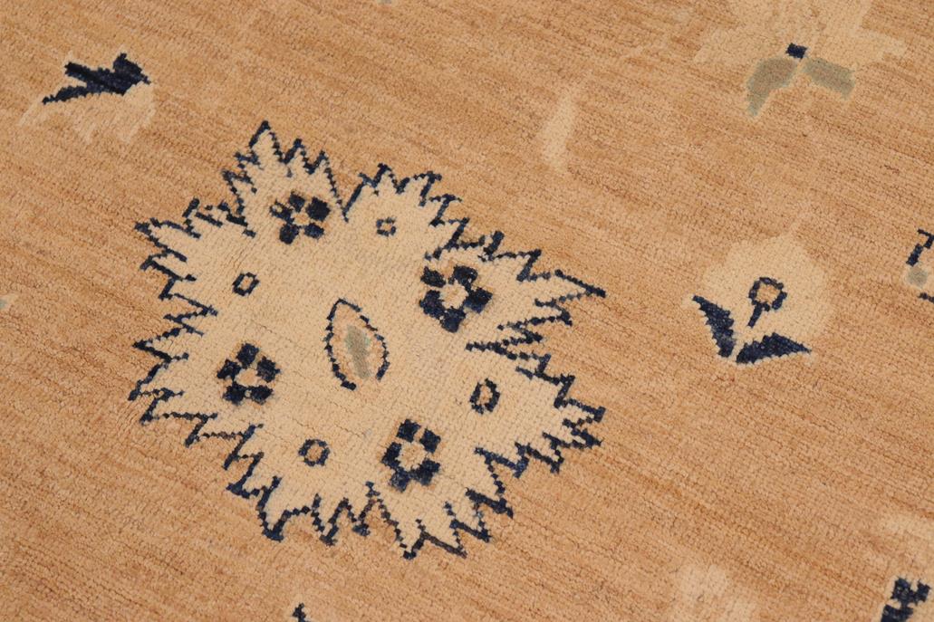 Enhance the ambiance of your home with this magnificent Persian-influenced Turkish hand-knotted rug made by skilled artisans capable of creating the most exceptional vegetable dyes and hand-spun wool. This exquisite handmade rug is a one-of-a-kind Peshawar Kafkaz, otherwise identified as Chobi, Chobi Peshawar, Oushak, or Ziegler rug. These handmade rugs are crafted in Pakistan utilizing superior-quality wool imported from Australia, New Zealand, and Korea in two types of weaves: the Persian weave and the Mori weave. This rug is meticulously crafted by hand using the finest natural vegetable dyes extracted from local plants. The artisans use a blend of hand-spun local and fine merino wool, resulting in a rug with a compelling texture, higher lanolin content, and longer staple. The artisans occasionally incorporate natural or artificial silk into the pile to enhance specific motifs. The finished product is an awe-inspiring execution of flawless design and an understated palette that exudes elegance. Contemporary Peshawar rugs draw inspiration from antique Persian designs and feature modern design motifs with vibrant color tones. Hand-knotted with all-natural dyes, resulting in a unique abrash effect and subtle color variations in the pile. Peshawar rugs are known for their stunning and vibrant colors, achieved through a process inspired by antique methods. The rug's pile is meticulously trimmed to a moderate thickness and then stone-washed and sun-dried, resulting in a natural sheen and pleasing color tones. Transform the ambiance of your room into a luxurious haven with this gorgeous rug featuring a beautiful color palette. This stunning rug features an intricate oriental design that showcases royalty and seamlessly complements any decor. Its hand-knotted construction and natural fibers provide a soft and comfortable feel underfoot, making it the perfect addition to any room.