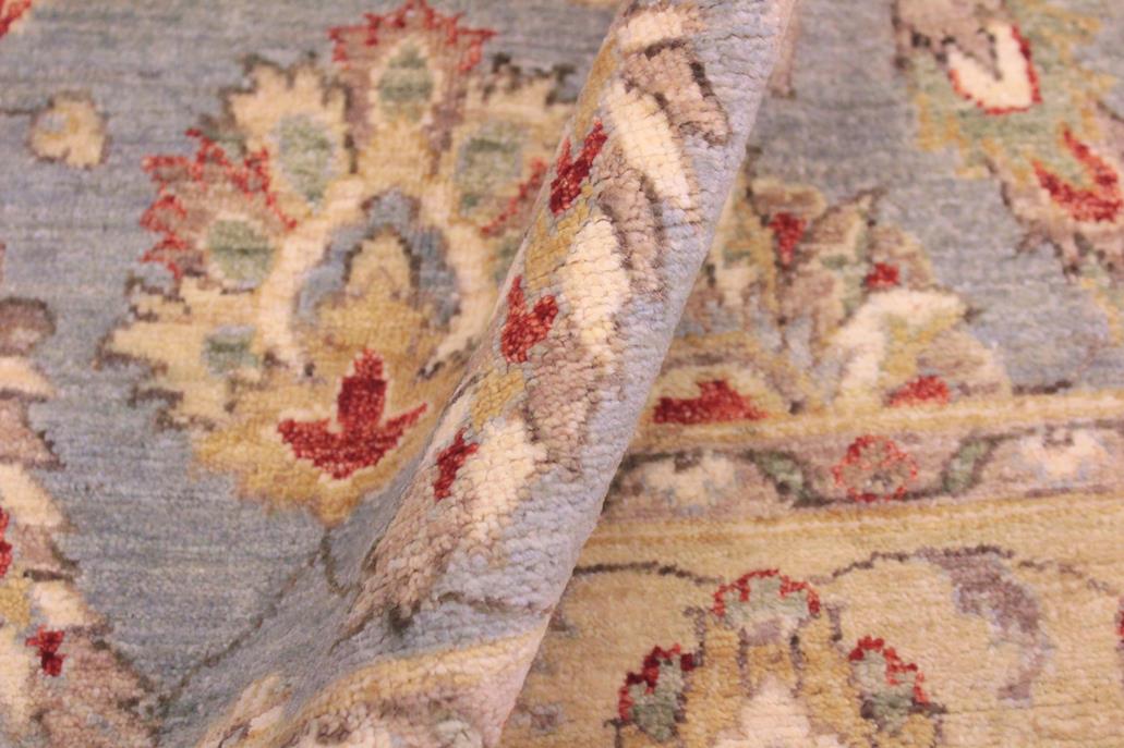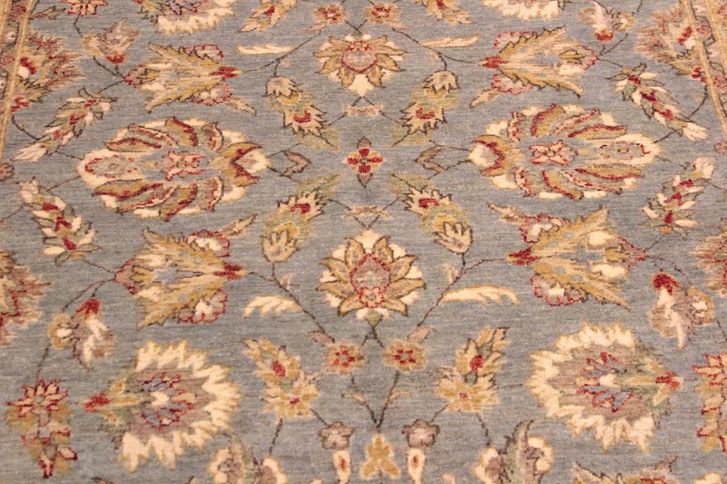 Enhance the ambiance of your home with this magnificent Persian-influenced Turkish hand-knotted rug made by skilled artisans capable of creating the most exceptional vegetable dyes and hand-spun wool. This exquisite handmade rug is a one-of-a-kind Peshawar Kafkaz, otherwise identified as Chobi, Chobi Peshawar, Oushak, or Ziegler rug. These handmade rugs are crafted in Pakistan utilizing superior-quality wool imported from Australia, New Zealand, and Korea in two types of weaves: the Persian weave and the Mori weave. This rug is meticulously crafted by hand using the finest natural vegetable dyes extracted from local plants. The artisans use a blend of hand-spun local and fine merino wool, resulting in a rug with a compelling texture, higher lanolin content, and longer staple. The artisans occasionally incorporate natural or artificial silk into the pile to enhance specific motifs. The finished product is an awe-inspiring flawless design execution and an understated palette that exudes elegance. Contemporary Peshawar rugs draw inspiration from antique Persian designs and feature modern design motifs with vibrant color tones. Hand-knotted with all-natural dyes, resulting in a unique abrash effect and subtle color variations in the pile. Peshawar rugs are known for their stunning and vibrant colors, which were achieved through a process inspired by antique methods. The rug's pile is meticulously trimmed to a moderate thickness and then stone-washed and sun-dried, resulting in a natural sheen and pleasing color tones. Transform the ambiance of your room into a luxurious haven with this gorgeous rug featuring a beautiful color palette. This stunning rug features an intricate oriental design that showcases royalty and seamlessly complements any decor. Its hand-knotted construction and natural fibers provide a soft and comfortable feel underfoot, making it the perfect addition to any room.