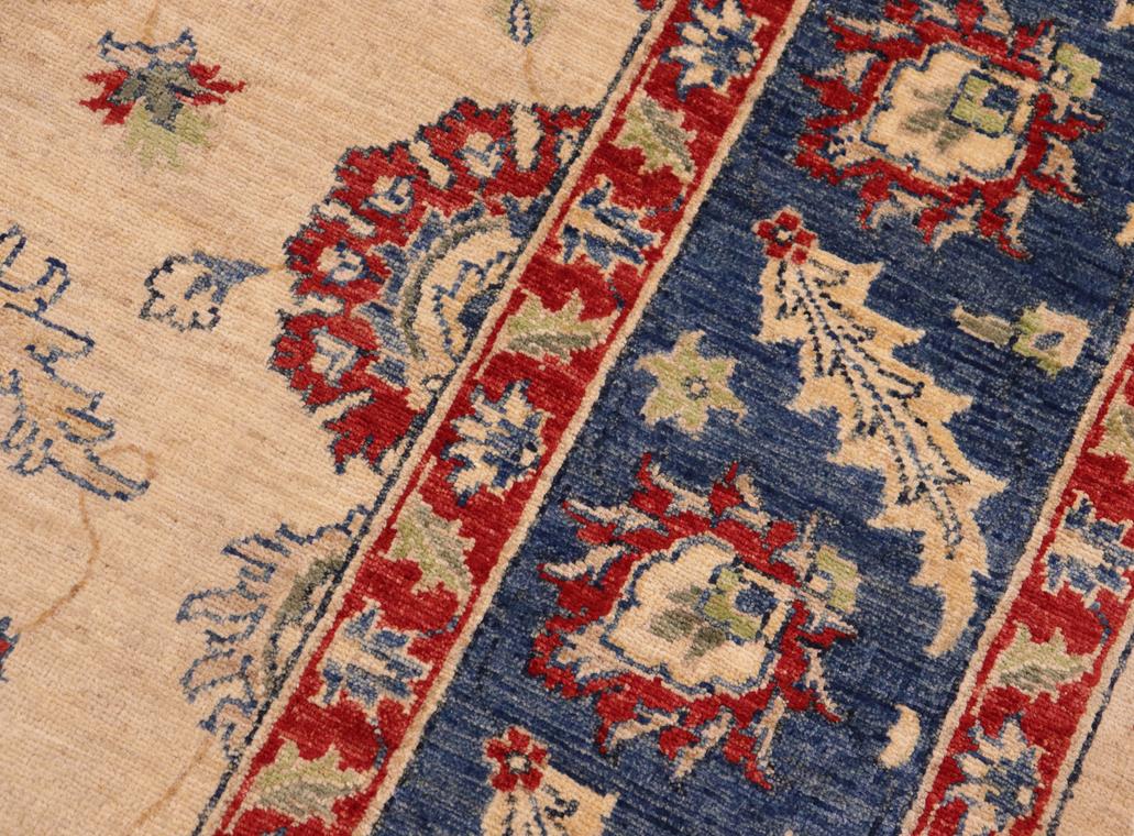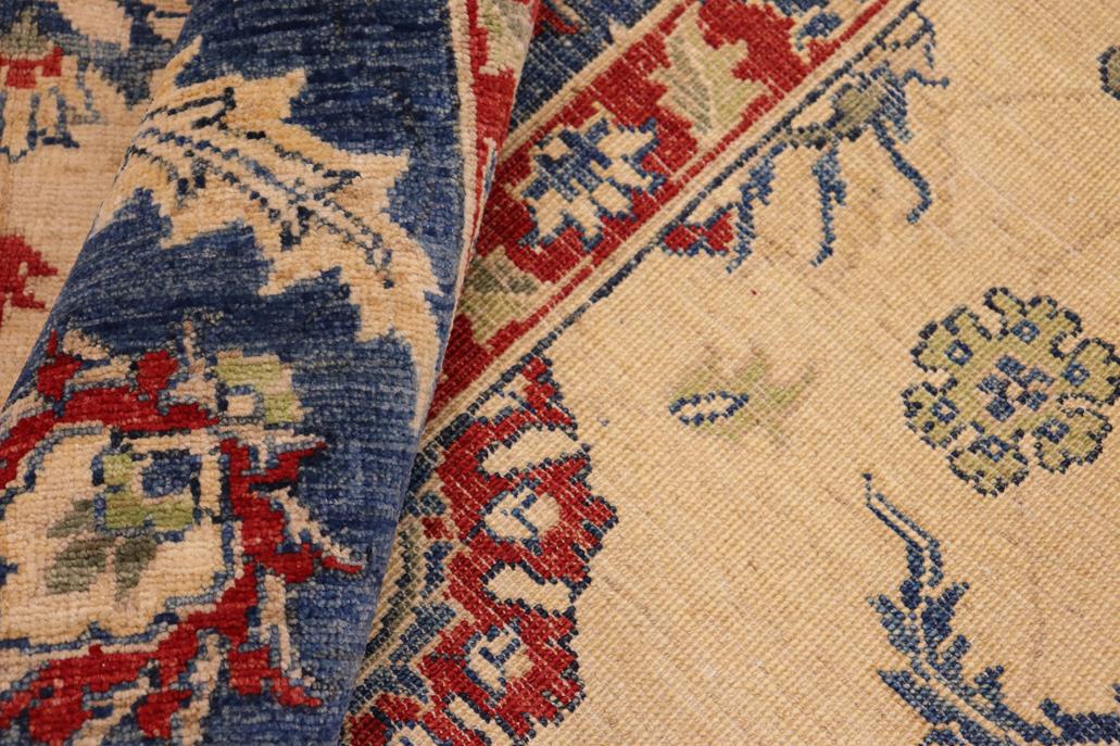 Enhance the ambiance of your home with this magnificent Persian-influenced Turkish hand-knotted rug made by skilled artisans capable of creating the most exceptional vegetable dyes and hand-spun wool. This exquisite handmade rug is a one-of-a-kind Peshawar Kafkaz, otherwise identified as Chobi, Chobi Peshawar, Oushak, or Ziegler rug. These handmade rugs are crafted in Pakistan utilizing superior-quality wool imported from Australia, New Zealand, and Korea in two types of weaves: the Persian weave and the Mori weave. This rug is meticulously crafted by hand using the finest natural vegetable dyes extracted from local plants. The artisans use a blend of hand-spun local and fine merino wool, resulting in a rug with a compelling texture, higher lanolin content, and longer staple. The artisans occasionally incorporate natural or artificial silk into the pile to enhance specific motifs. The finished product is an awe-inspiring flawless design execution and an understated palette that exudes elegance. Contemporary Peshawar rugs draw inspiration from antique Persian designs and feature modern design motifs with vibrant color tones. Hand-knotted with all-natural dyes, resulting in a unique abrash effect and subtle color variations in the pile. Peshawar rugs are known for their stunning and vibrant colors, which were achieved through a process inspired by antique methods. The rug's pile is meticulously trimmed to a moderate thickness and then stone-washed and sun-dried, resulting in a natural sheen and pleasing color tones. Transform the ambiance of your room into a luxurious haven with this gorgeous rug featuring a beautiful color palette. This stunning rug features an intricate oriental design that showcases royalty and seamlessly complements any decor. Its hand-knotted construction and natural fibers provide a soft and comfortable feel underfoot, making it the perfect addition to any room.