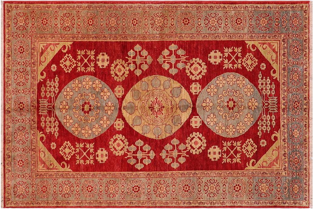 Enhance the ambiance of your home with this magnificent Persian-influenced Turkish hand-knotted rug made by skilled artisans capable of creating the most exceptional vegetable dyes and hand-spun wool. This exquisite handmade rug is a one-of-a-kind Peshawar Kafkaz, otherwise identified as Chobi, Chobi Peshawar, Oushak, or Ziegler rug. These handmade rugs are crafted in Pakistan utilizing superior-quality wool imported from Australia, New Zealand, and Korea in two types of weaves: the Persian weave and the Mori weave. This rug is meticulously crafted by hand using the finest natural vegetable dyes extracted from local plants. The artisans use a blend of hand-spun local and fine merino wool, resulting in a rug with a compelling texture, higher lanolin content, and longer staple. The artisans occasionally incorporate natural or artificial silk into the pile to enhance specific motifs. The finished product is an awe-inspiring execution of flawless design and an understated palette that exudes elegance. Contemporary Peshawar rugs draw inspiration from antique Persian designs and feature modern design motifs with vibrant color tones. Hand-knotted with all-natural dyes, resulting in a unique abrash effect and subtle color variations in the pile. Peshawar rugs are known for their stunning and vibrant colors, achieved through a process inspired by antique methods. The rug's pile is meticulously trimmed to a moderate thickness and then stone-washed and sun-dried, resulting in a natural sheen and pleasing color tones. Transform the ambiance of your room into a luxurious haven with this gorgeous rug featuring a beautiful color palette. This stunning rug features an intricate oriental design that showcases royalty and seamlessly complements any decor. Its hand-knotted construction and natural fibers provide a soft and comfortable feel underfoot, making it the perfect addition to any room.