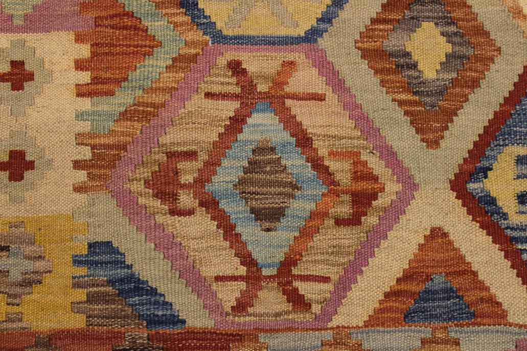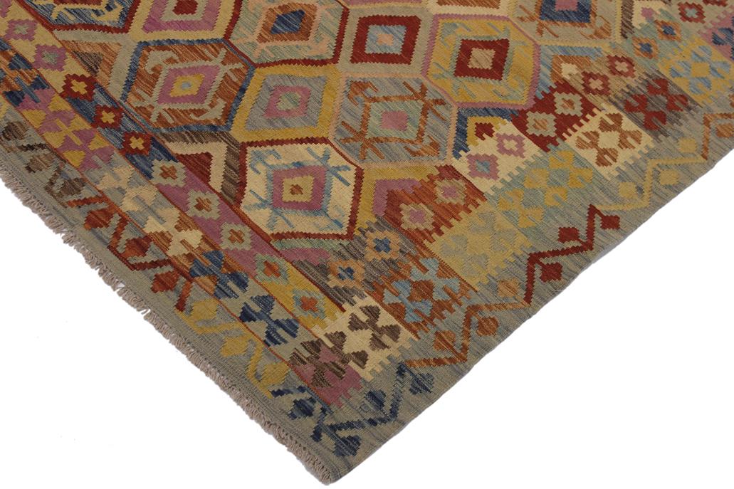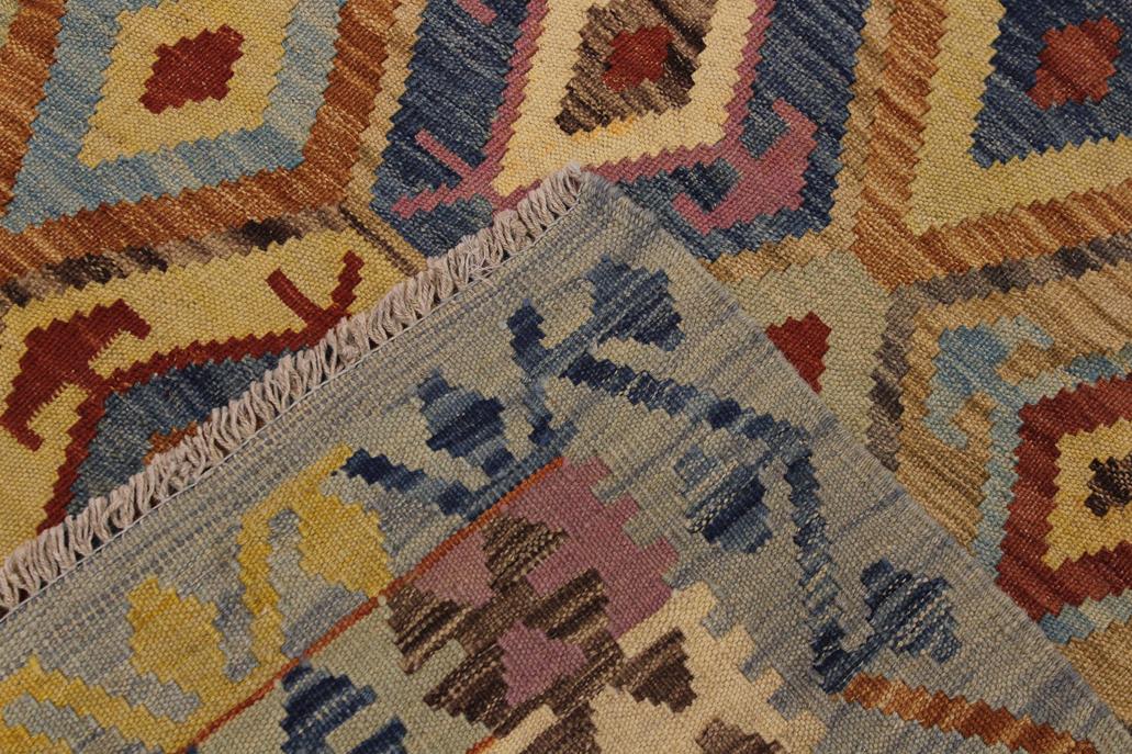 Elevate the elegance of your home with this stunning hand-woven tribal Kilim wool rug. Meticulously crafted on a loom by the Nomad Turkman people using hand-spun wool and 100% natural vegetable dyes, these rugs are recognized for their repetitive geometric patterns, incorporating naturalistic floral and traditional designs. The contemporary fashion palette results in bold, sharp patterns that are incredibly versatile, as the pattern is the same on both sides. These reversible rugs feature a lighter shade on one side and brighter colors on the other, providing versatility according to preference. These unique rugs are made by knotting short strands of different colors onto the warps and securing them by tightly pressing the wefts. The designs are created by interweaving the various colored wefts and warps. Kilims are known for their exceptional durability and versatility, making them truly unique rugs.