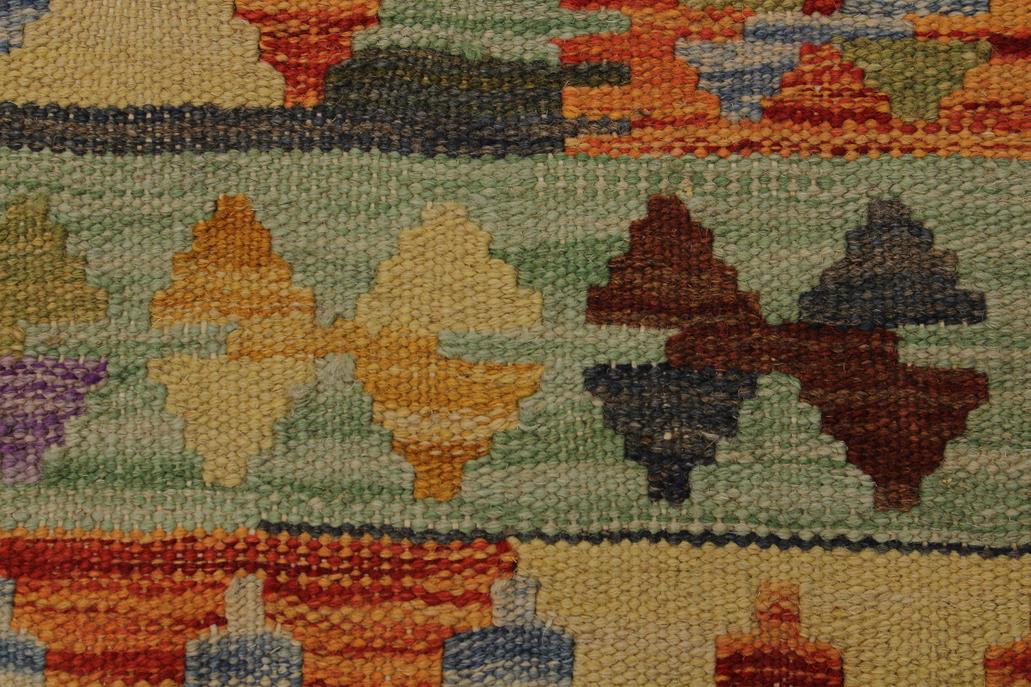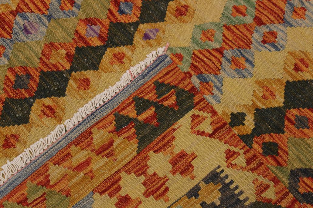 Elevate the elegance of your home with this stunning hand-woven tribal Kilim wool rug. Meticulously crafted on a loom by the Nomad Turkman people using hand-spun wool and 100% natural vegetable dyes, these rugs are recognized for their repetitive geometric patterns, incorporating naturalistic floral and traditional designs. The contemporary fashion palette results in bold, sharp patterns that are incredibly versatile, as the pattern is the same on both sides. These reversible rugs feature a lighter shade on one side and brighter colors on the other, providing versatility according to preference. These unique rugs are made by knotting short strands of different colors onto the warps and securing them by tightly pressing the wefts. The designs are created by interweaving the various colored wefts and warps. Kilims are known for their exceptional durability and versatility, making them truly unique rugs.