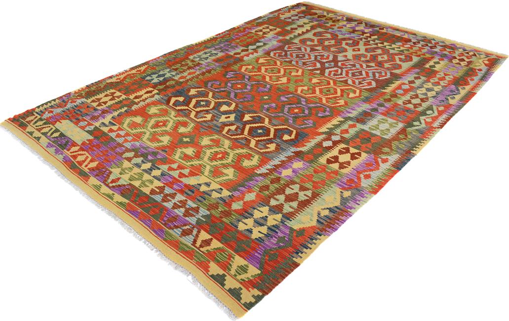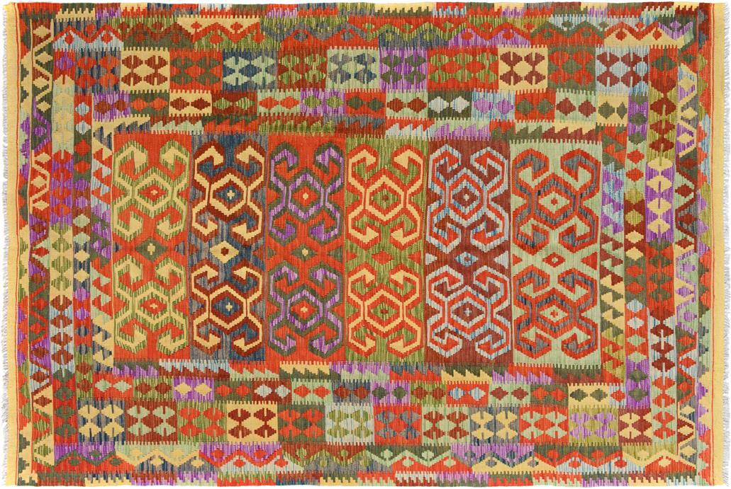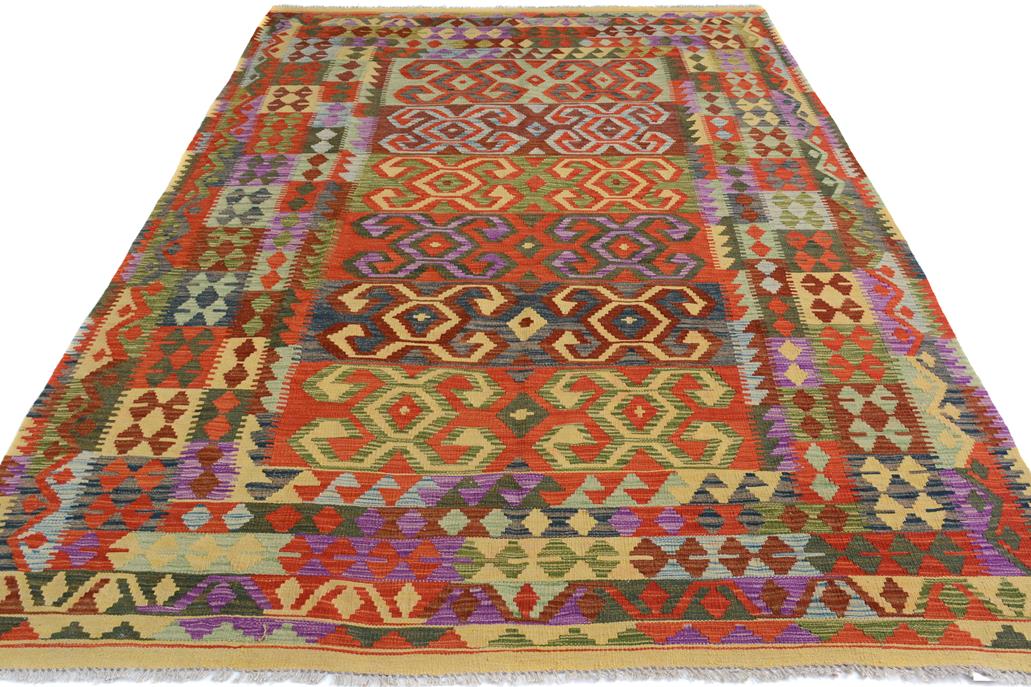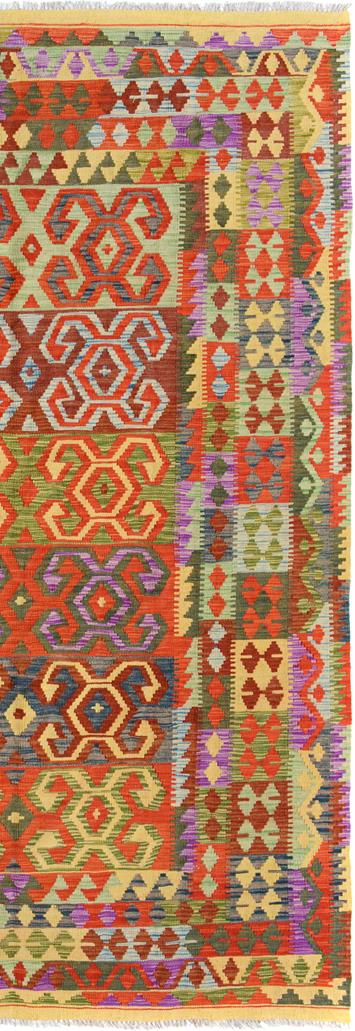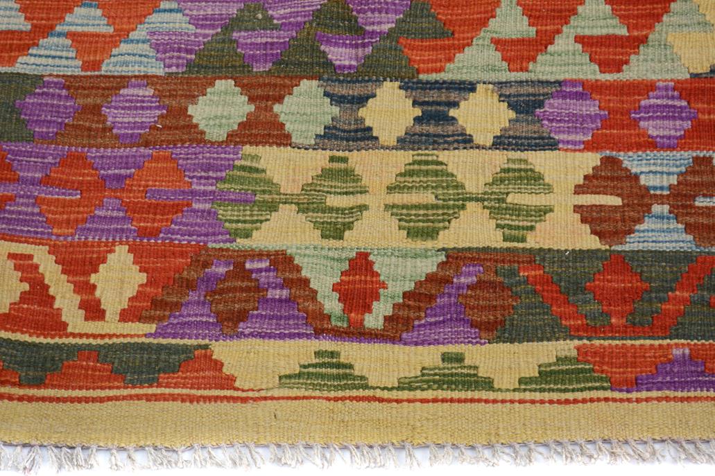 Elevate the elegance of your home with this stunning hand-woven tribal Kilim wool rug. Meticulously crafted on a loom by the Nomad Turkman people using hand-spun wool and 100% natural vegetable dyes, these rugs are recognized for their repetitive geometric patterns, incorporating naturalistic floral and traditional designs. The contemporary fashion palette results in bold, sharp patterns that are incredibly versatile, as the pattern is the same on both sides. These reversible rugs feature a lighter shade on one side and brighter colors on the other, providing versatility according to preference. These unique rugs are made by knotting short strands of different colors onto the warps and securing them by tightly pressing the wefts. The designs are created by interweaving the various colored wefts and warps. Kilims are known for their exceptional durability and versatility, making them truly unique rugs.