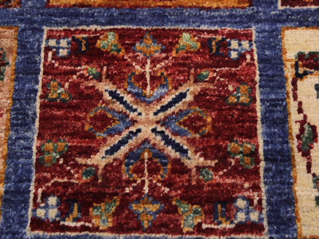 Designed with a mesmerizing intricate transitional and geometric motif this glorious hand knotted rug made with handspun Ghazni wool is a masterpiece that will fill any space with sophistication and grace. Hand knotted by skilled artisans in an exhilarating color pallet with an elaborate design, this masterpiece features luxurious hand spun wool with all vegetable dyes to add comfort and style to your decor. The design, color, and beautiful chromatic composition with a sheen in transitional and geometric designs, exude beauty, elegance and quality make this rug an extraordinarily opulent center piece for your living space. The intricate designs known as Khurgeen, Khorgeen or Khorjin range are inspired by the patterns from ancient tribal bags. An infusion of bold, saturated color gives this traditional hand-knotted rug a fresh perspective and modern appeal. Most desired due to its versatility in design and affordability this handmade rug is in a compelling focal point in any living area.
