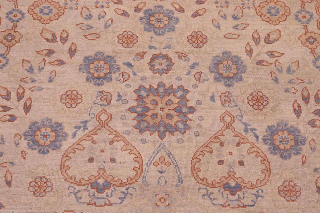 Enhance the ambiance of your home with this magnificent Persian-influenced Turkish hand-knotted rug made by skilled artisans capable of creating the most exceptional vegetable dyes and hand-spun wool. This exquisite handmade rug is a one-of-a-kind Peshawar Kafkaz, otherwise identified as Chobi, Chobi Peshawar, Oushak, or Ziegler rug. These handmade rugs are crafted in Pakistan utilizing superior-quality wool imported from Australia, New Zealand, and Korea in two types of weaves: the Persian weave and the Mori weave. This rug is meticulously crafted by hand using the finest natural vegetable dyes extracted from local plants. The artisans use a blend of hand-spun local and fine merino wool, resulting in a rug with a compelling texture, higher lanolin content, and longer staple. The artisans occasionally incorporate natural or artificial silk into the pile to enhance specific motifs. The finished product is an awe-inspiring execution of flawless design and an understated palette that exudes elegance. Contemporary Peshawar rugs draw inspiration from antique Persian designs and feature modern design motifs with vibrant color tones. Hand-knotted with all-natural dyes, resulting in a unique abrash effect and subtle color variations in the pile. Peshawar rugs are known for their stunning and vibrant colors, achieved through a process inspired by antique methods. The rug's pile is meticulously trimmed to a moderate thickness and then stone-washed and sun-dried, resulting in a natural sheen and pleasing color tones. Transform the ambiance of your room into a luxurious haven with this gorgeous rug featuring a beautiful color palette. This stunning rug features an intricate oriental design that showcases royalty and seamlessly complements any decor. Its hand-knotted construction and natural fibers provide a soft and comfortable feel underfoot, making it the perfect addition to any room.