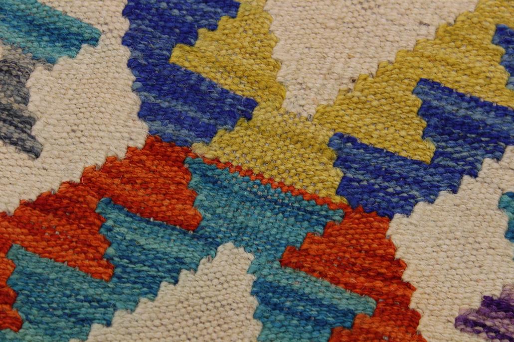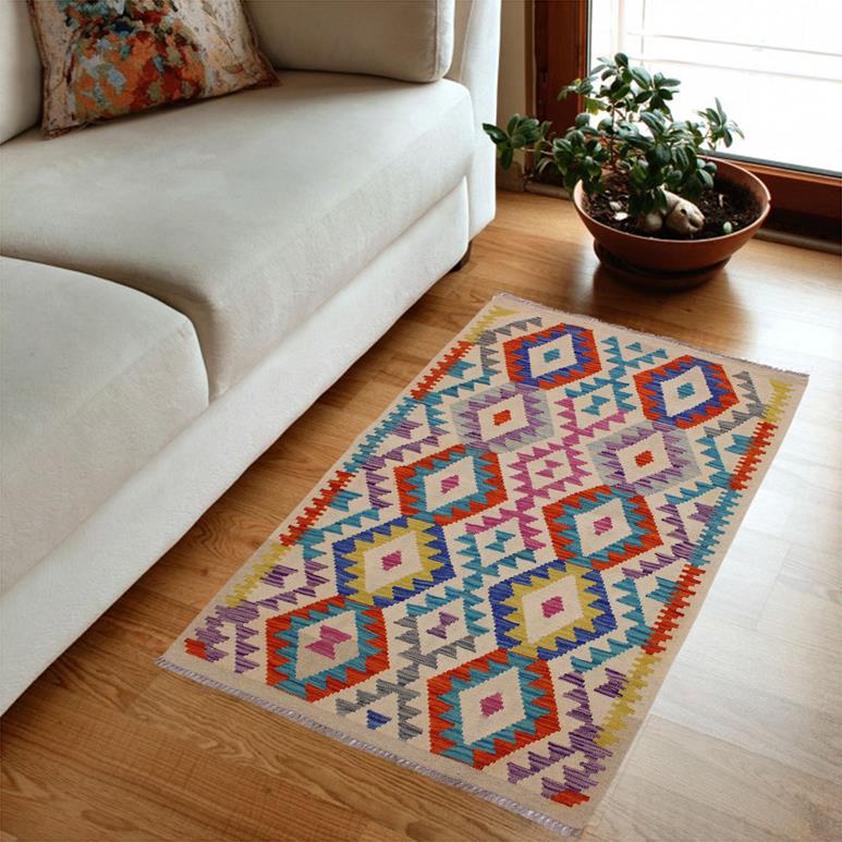 Elevate the elegance of your home with this stunning hand-woven tribal Kilim wool rug. Meticulously crafted on a loom by the Nomad Turkman people using hand-spun wool and 100% natural vegetable dyes, these rugs are recognized for their repetitive geometric patterns, incorporating naturalistic floral and traditional designs. The contemporary fashion palette results in bold, sharp patterns that are incredibly versatile, as the pattern is the same on both sides. These reversible rugs feature a lighter shade on one side and brighter colors on the other, providing versatility according to preference. These unique rugs are made by knotting short strands of different colors onto the warps and securing them by tightly pressing the wefts. The designs are created by interweaving the various colored wefts and warps. Kilims are known for their exceptional durability and versatility, making them truly unique rugs.