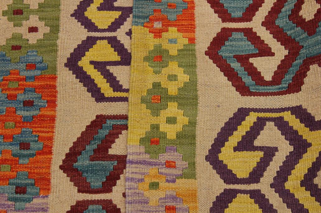 Elevate the elegance of your home with this stunning hand-woven tribal Kilim wool rug. Meticulously crafted on a loom by the Nomad Turkman people using hand-spun wool and 100% natural vegetable dyes, these rugs are recognized for their repetitive geometric patterns, incorporating naturalistic floral and traditional designs. The contemporary fashion palette results in bold, sharp patterns that are incredibly versatile, as the pattern is the same on both sides. These reversible rugs feature a lighter shade on one side and brighter colors on the other, providing versatility according to preference. These unique rugs are made by knotting short strands of different colors onto the warps and securing them by tightly pressing the wefts. The designs are created by interweaving the various colored wefts and warps. Kilims are known for their exceptional durability and versatility, making them truly unique rugs.