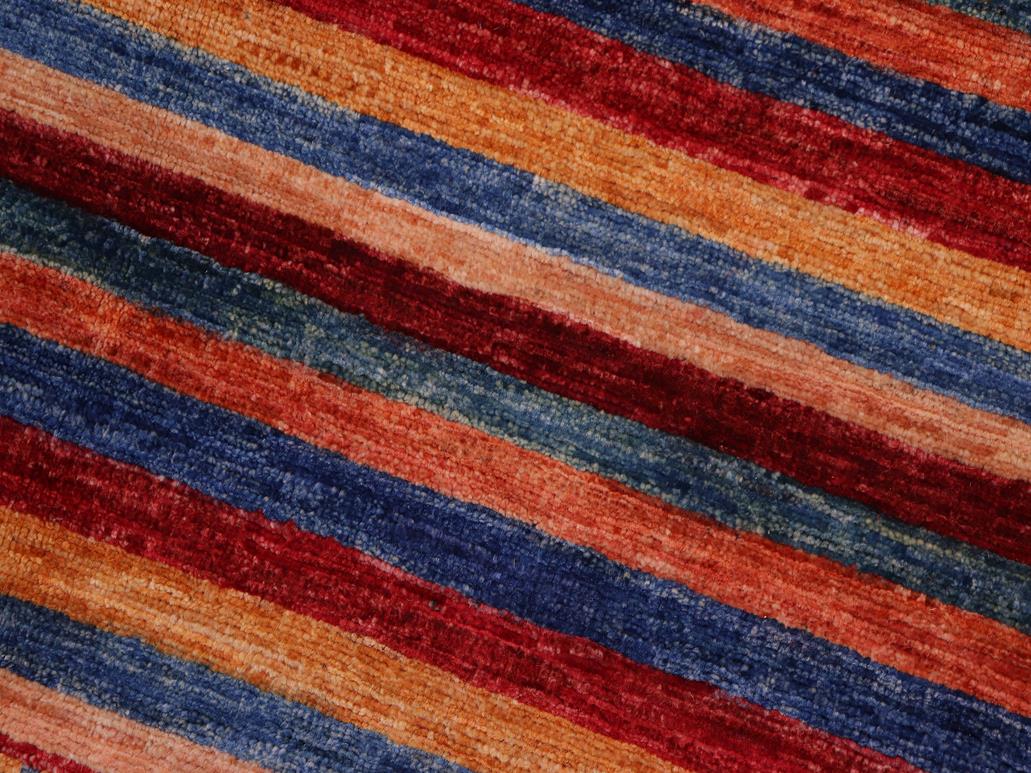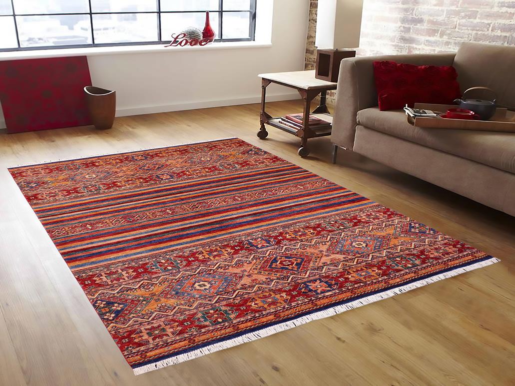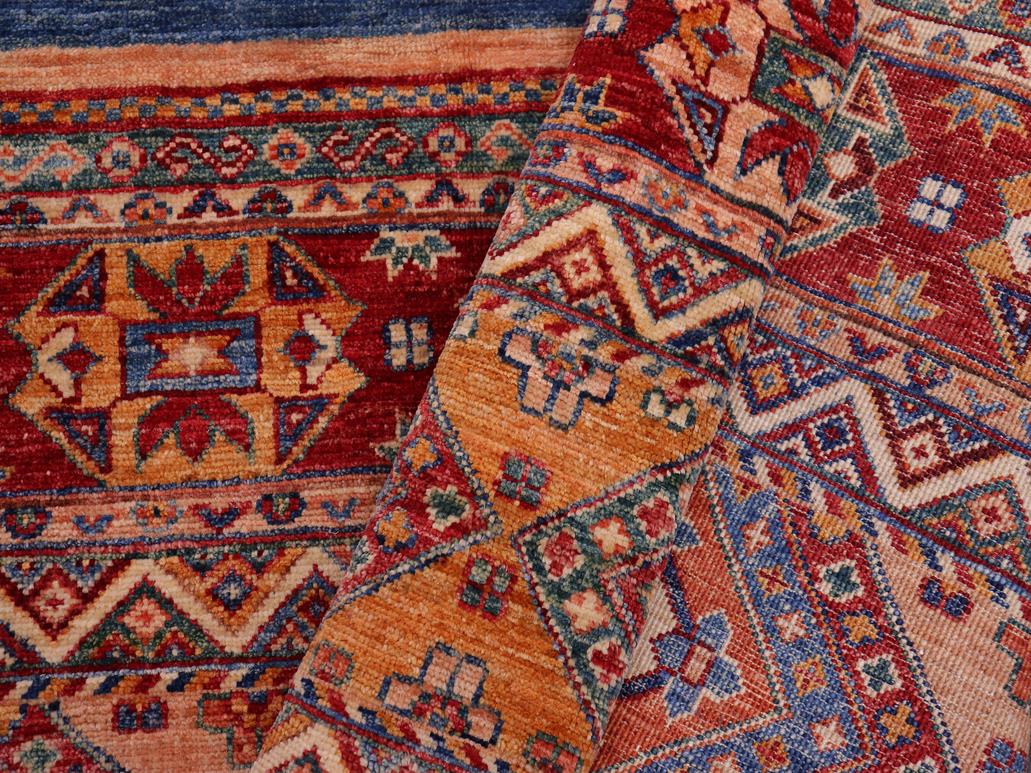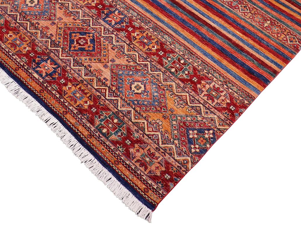 Designed with a mesmerizing intricate transitional and geometric motif this glorious hand knotted rug made with handspun Ghazni wool is a masterpiece that will fill any space with sophistication and grace. Hand knotted by skilled artisans in an exhilarating color pallet with an elaborate design, this masterpiece features luxurious hand spun wool with all vegetable dyes to add comfort and style to your decor. The design, color, and beautiful chromatic composition with a sheen in transitional and geometric designs, exude beauty, elegance and quality make this rug an extraordinarily opulent center piece for your living space. The intricate designs known as Khurgeen, Khorgeen or Khorjin range are inspired by the patterns from ancient tribal bags. An infusion of bold, saturated color gives this traditional hand-knotted rug a fresh perspective and modern appeal. Most desired due to its versatility in design and affordability this handmade rug is in a compelling focal point in any living area.