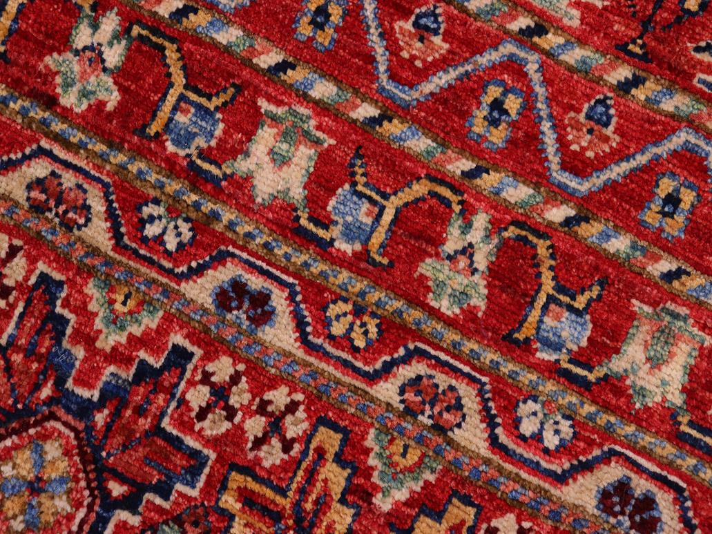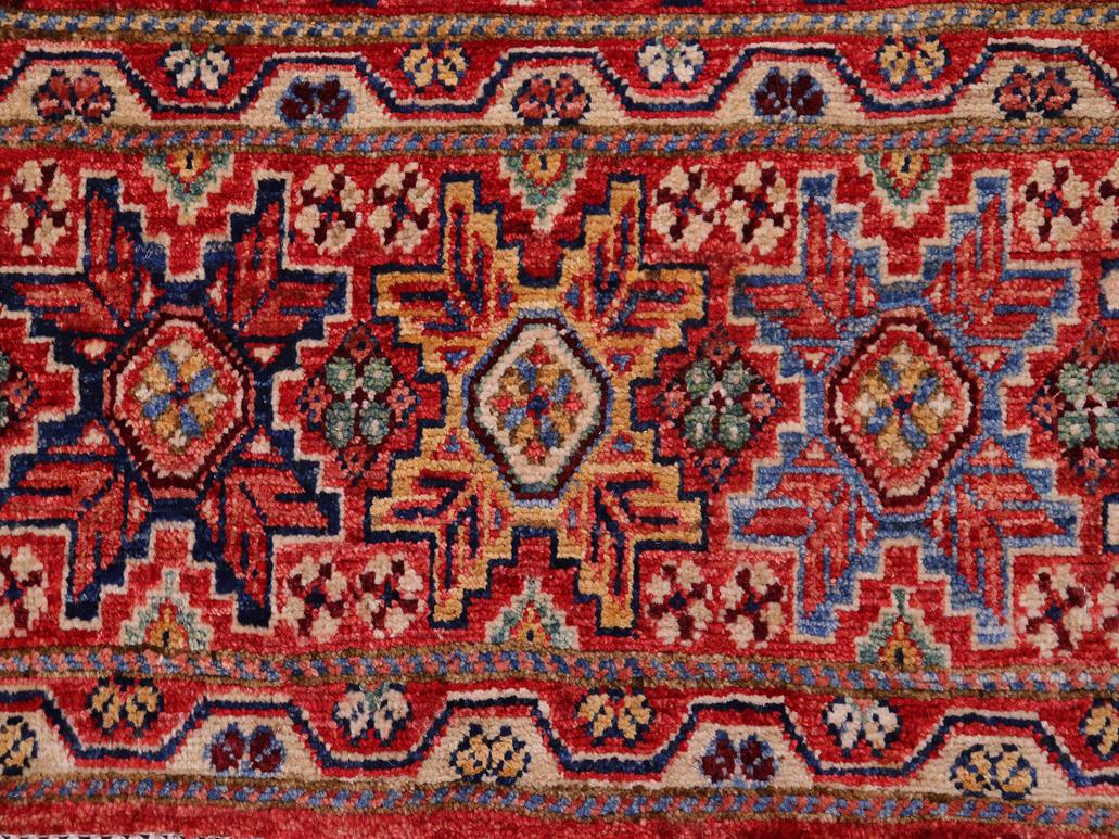 Designed with a mesmerizing intricate transitional and geometric motif this glorious hand knotted rug made with handspun Ghazni wool is a masterpiece that will fill any space with sophistication and grace. Hand knotted by skilled artisans in an exhilarating color pallet with an elaborate design, this masterpiece features luxurious hand spun wool with all vegetable dyes to add comfort and style to your decor. The design, color, and beautiful chromatic composition with a sheen in transitional and geometric designs, exude beauty, elegance and quality make this rug an extraordinarily opulent center piece for your living space. The intricate designs known as Khurgeen, Khorgeen or Khorjin range are inspired by the patterns from ancient tribal bags. An infusion of bold, saturated color gives this traditional hand-knotted rug a fresh perspective and modern appeal. Most desired due to its versatility in design and affordability this handmade rug is in a compelling focal point in any living area.