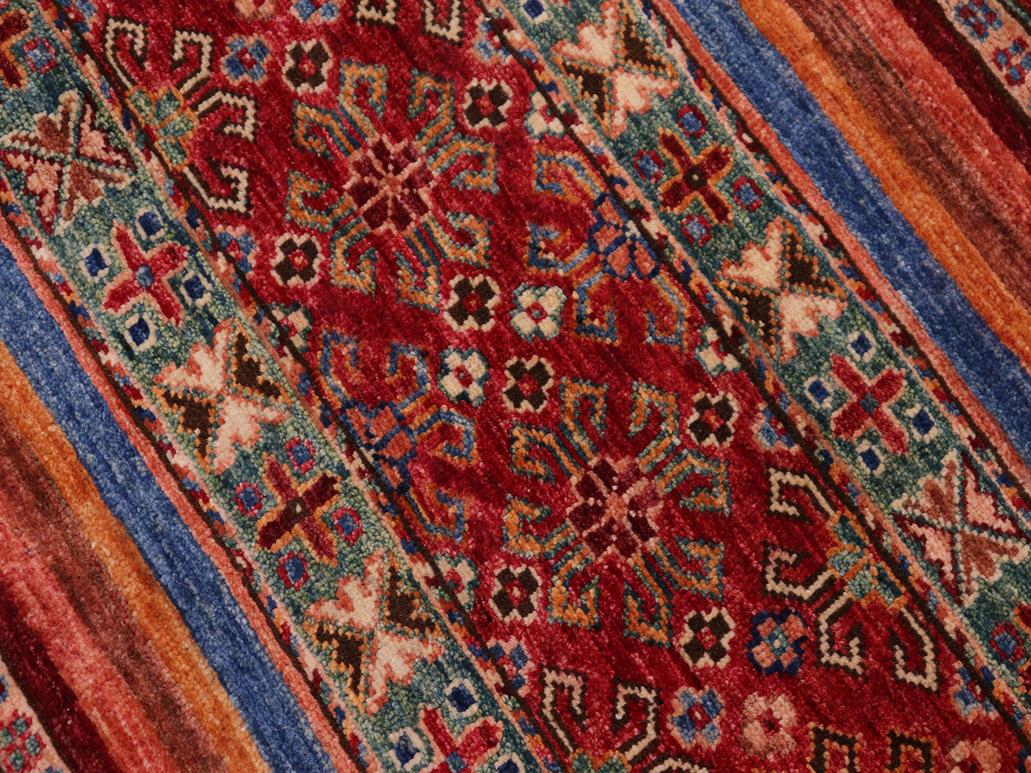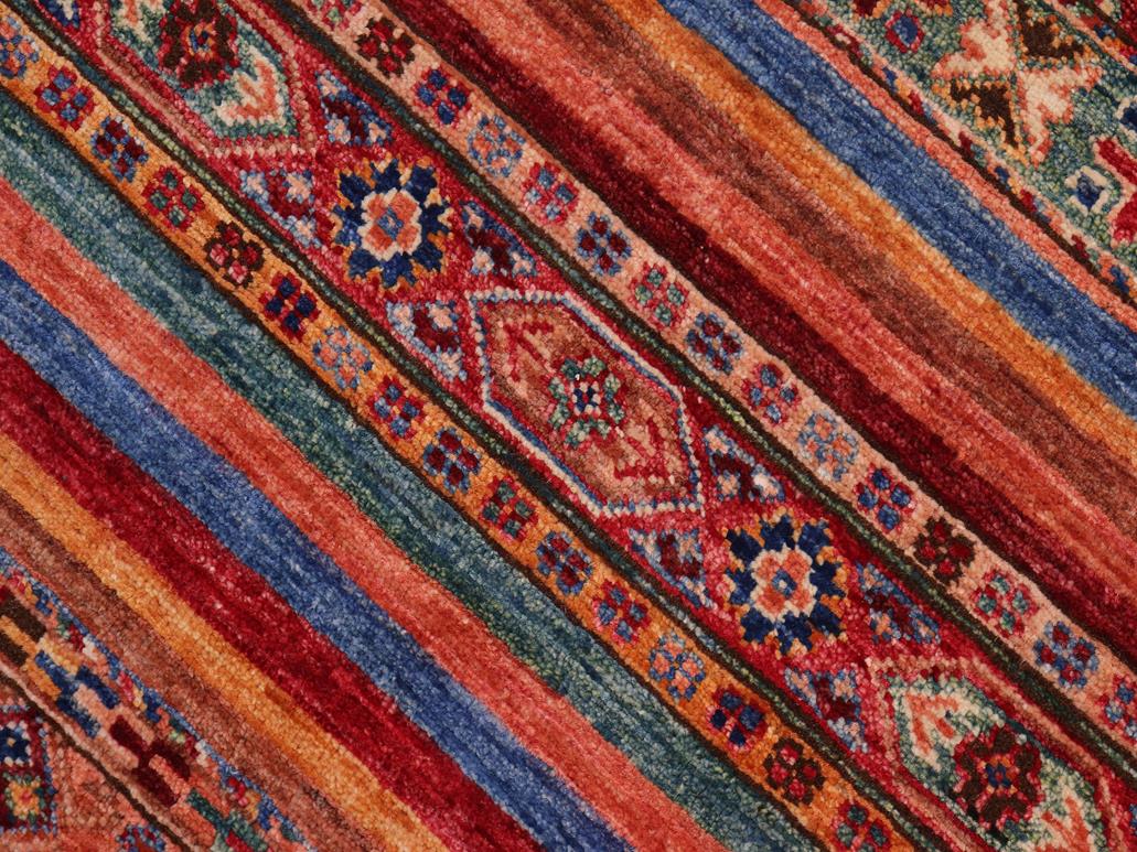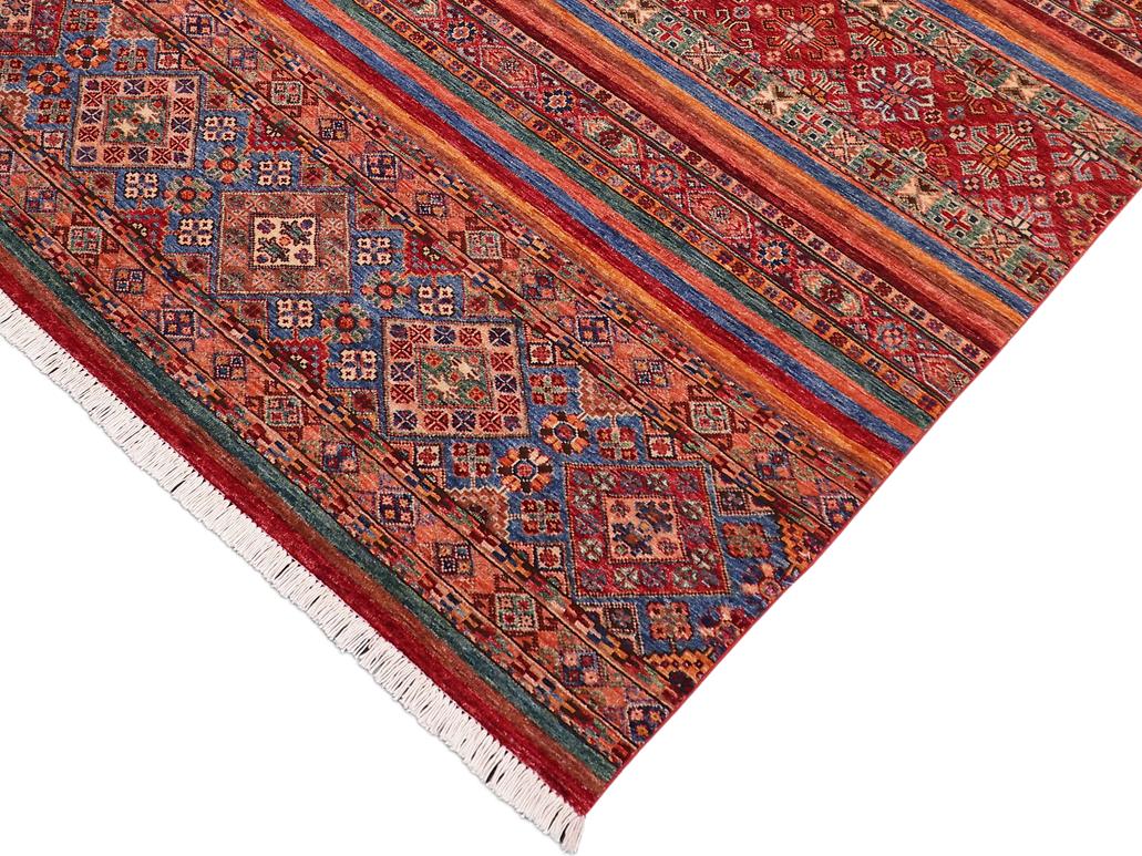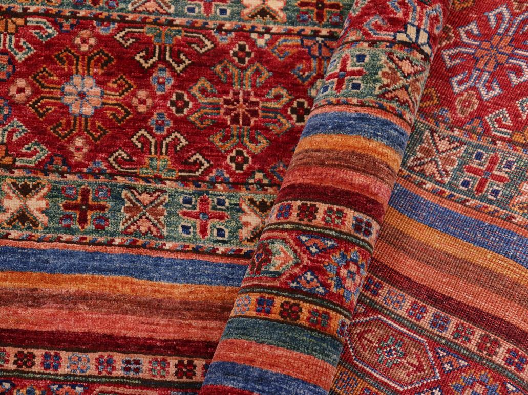 Designed with a mesmerizing intricate transitional and geometric motif this glorious hand knotted rug made with handspun Ghazni wool is a masterpiece that will fill any space with sophistication and grace. Hand knotted by skilled artisans in an exhilarating color pallet with an elaborate design, this masterpiece features luxurious hand spun wool with all vegetable dyes to add comfort and style to your decor. The design, color, and beautiful chromatic composition with a sheen in transitional and geometric designs, exude beauty, elegance and quality make this rug an extraordinarily opulent center piece for your living space. The intricate designs known as Khurgeen, Khorgeen or Khorjin range are inspired by the patterns from ancient tribal bags. An infusion of bold, saturated color gives this traditional hand-knotted rug a fresh perspective and modern appeal. Most desired due to its versatility in design and affordability this handmade rug is in a compelling focal point in any living area.