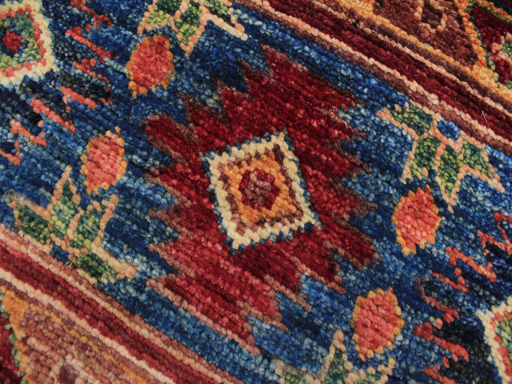 Designed with a mesmerizing intricate transitional and geometric motif this glorious hand knotted rug made with handspun Ghazni wool is a masterpiece that will fill any space with sophistication and grace. Hand knotted by skilled artisans in an exhilarating color pallet with an elaborate design, this masterpiece features luxurious hand spun wool with all vegetable dyes to add comfort and style to your decor. The design, color, and beautiful chromatic composition with a sheen in transitional and geometric designs, exude beauty, elegance and quality make this rug an extraordinarily opulent center piece for your living space. The intricate designs known as Khurgeen, Khorgeen or Khorjin range are inspired by the patterns from ancient tribal bags. An infusion of bold, saturated color gives this traditional hand-knotted rug a fresh perspective and modern appeal. Most desired due to its versatility in design and affordability this handmade rug is in a compelling focal point in any living area.