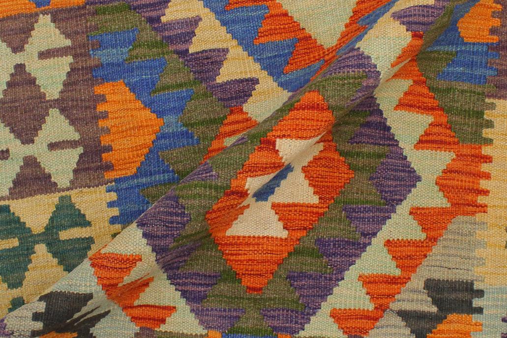 Elevate the elegance of your home with this stunning hand-woven tribal Kilim wool rug. Meticulously crafted on a loom by the Nomad Turkman people using hand-spun wool and 100% natural vegetable dyes, these rugs are recognized for their repetitive geometric patterns, incorporating naturalistic floral and traditional designs. The contemporary fashion palette results in bold, sharp patterns that are incredibly versatile, as the pattern is the same on both sides. These reversible rugs feature a lighter shade on one side and brighter colors on the other, providing versatility according to preference. These unique rugs are made by knotting short strands of different colors onto the warps and securing them by tightly pressing the wefts. The designs are created by interweaving the various colored wefts and warps. Kilims are known for their exceptional durability and versatility, making them truly unique rugs.