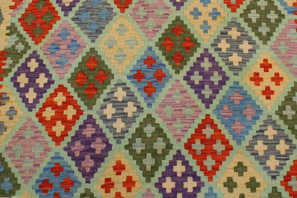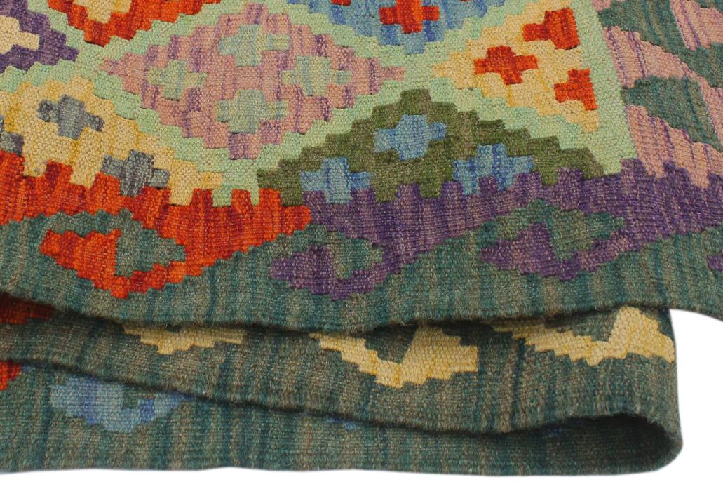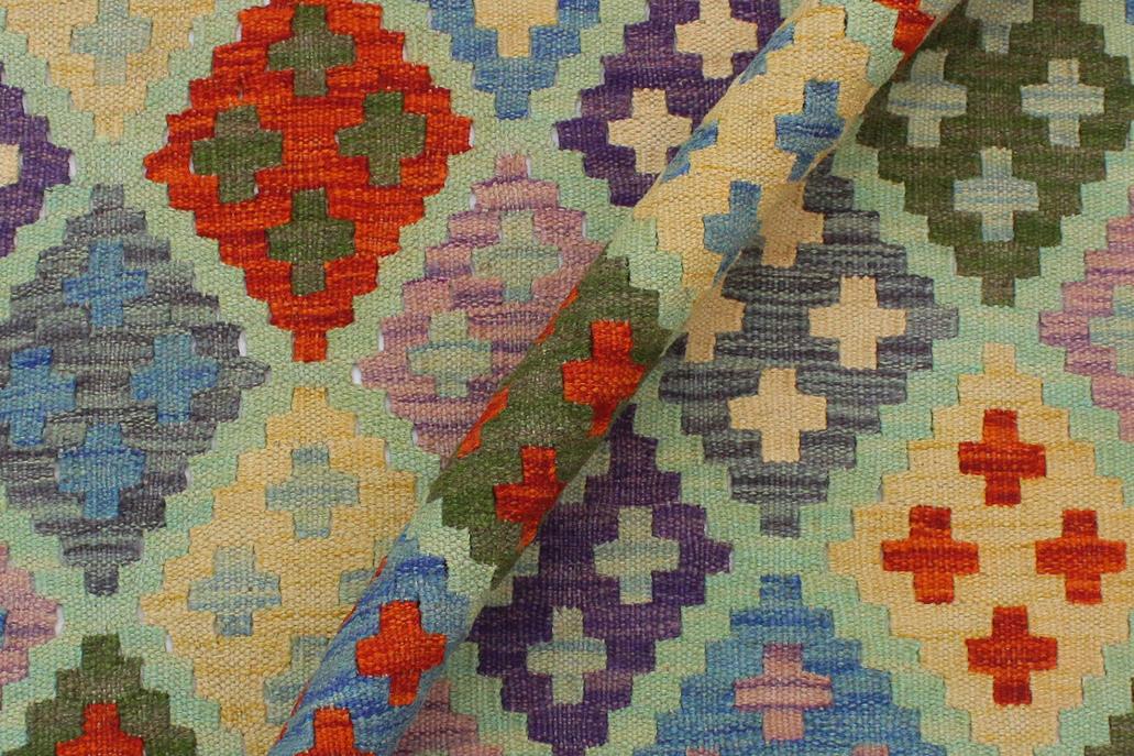 Elevate the elegance of your home with this stunning hand-woven tribal Kilim wool rug. Meticulously crafted on a loom by the Nomad Turkman people using hand-spun wool and 100% natural vegetable dyes, these rugs are recognized for their repetitive geometric patterns, incorporating naturalistic floral and traditional designs. The contemporary fashion palette results in bold, sharp patterns that are incredibly versatile, as the pattern is the same on both sides. These reversible rugs feature a lighter shade on one side and brighter colors on the other, providing versatility according to preference. These unique rugs are made by knotting short strands of different colors onto the warps and securing them by tightly pressing the wefts. The designs are created by interweaving the various colored wefts and warps. Kilims are known for their exceptional durability and versatility, making them truly unique rugs.