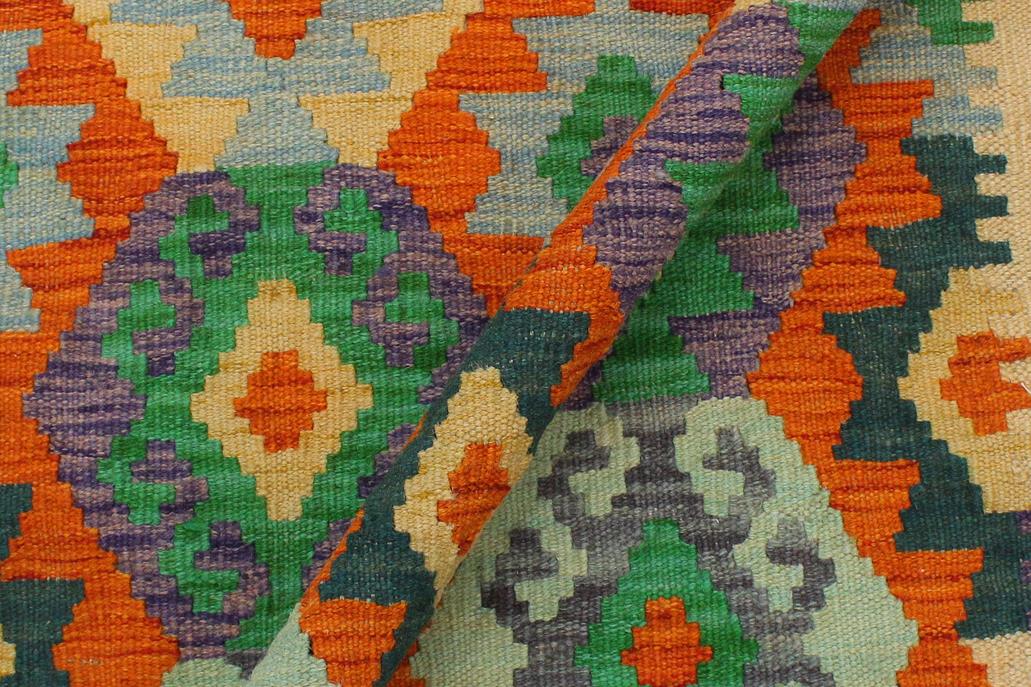 Elevate the elegance of your home with this stunning hand-woven tribal Kilim wool rug. Meticulously crafted on a loom by the Nomad Turkman people using hand-spun wool and 100% natural vegetable dyes, these rugs are recognized for their repetitive geometric patterns, incorporating naturalistic floral and traditional designs. The contemporary fashion palette results in bold, sharp patterns that are incredibly versatile, as the pattern is the same on both sides. These reversible rugs feature a lighter shade on one side and brighter colors on the other, providing versatility according to preference. These unique rugs are made by knotting short strands of different colors onto the warps and securing them by tightly pressing the wefts. The designs are created by interweaving the various colored wefts and warps. Kilims are known for their exceptional durability and versatility, making them truly unique rugs.