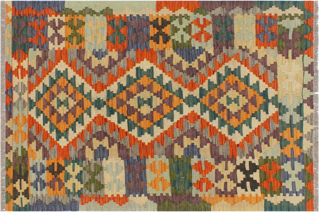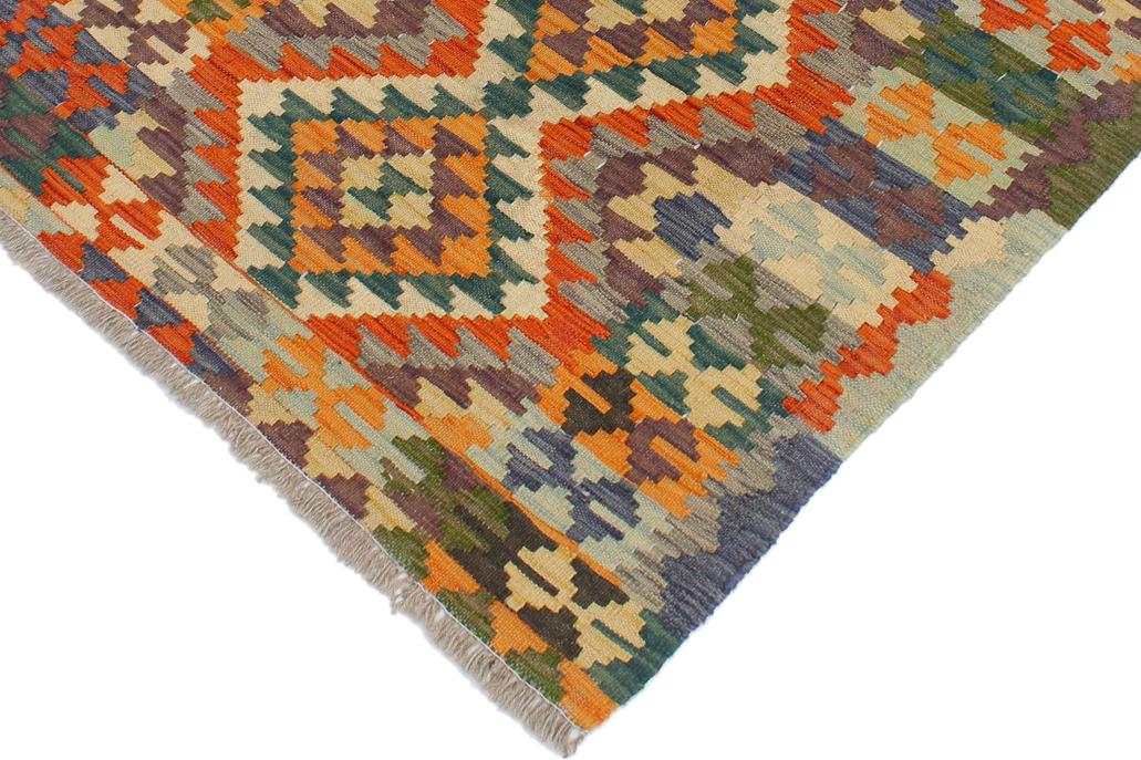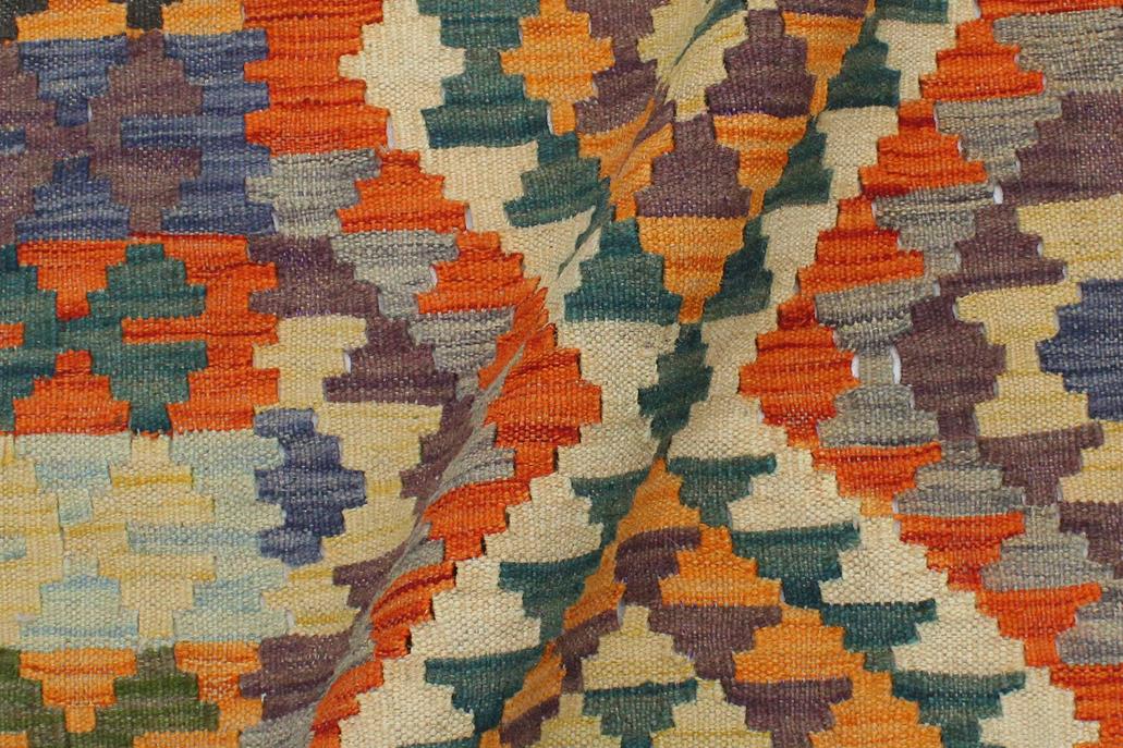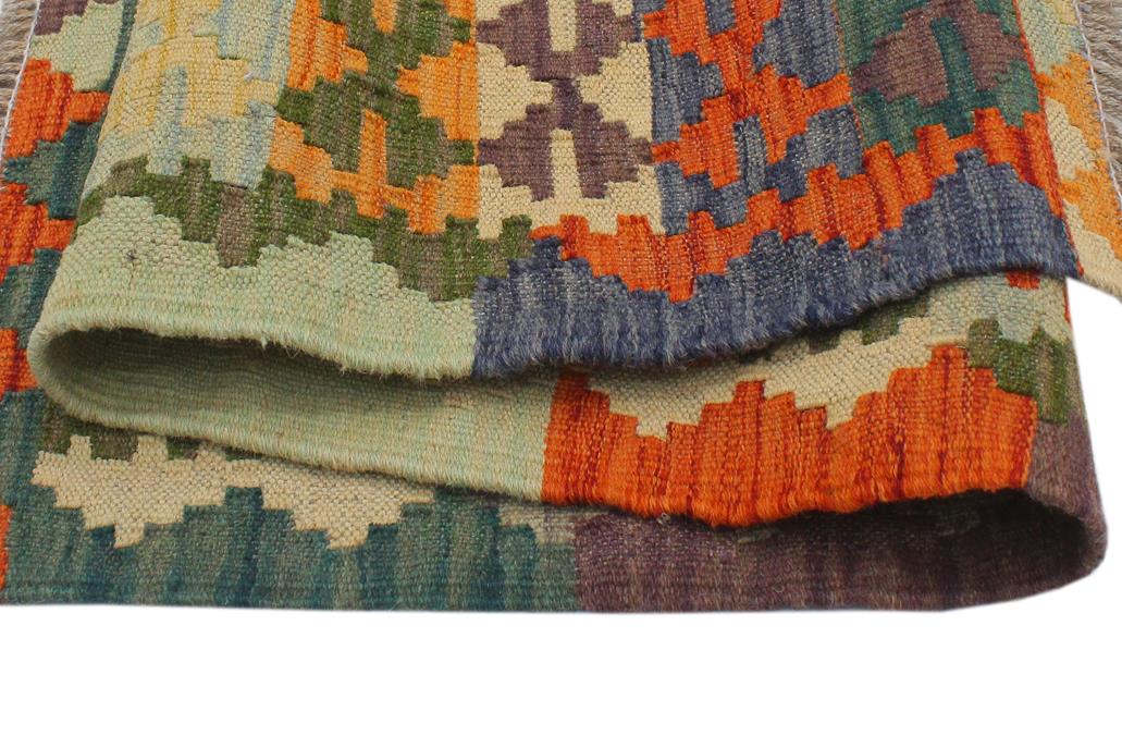 Elevate the elegance of your home with this stunning hand-woven tribal Kilim wool rug. Meticulously crafted on a loom by the Nomad Turkman people using hand-spun wool and 100% natural vegetable dyes, these rugs are recognized for their repetitive geometric patterns, incorporating naturalistic floral and traditional designs. The contemporary fashion palette results in bold, sharp patterns that are incredibly versatile, as the pattern is the same on both sides. These reversible rugs feature a lighter shade on one side and brighter colors on the other, providing versatility according to preference. These unique rugs are made by knotting short strands of different colors onto the warps and securing them by tightly pressing the wefts. The designs are created by interweaving the various colored wefts and warps. Kilims are known for their exceptional durability and versatility, making them truly unique rugs.