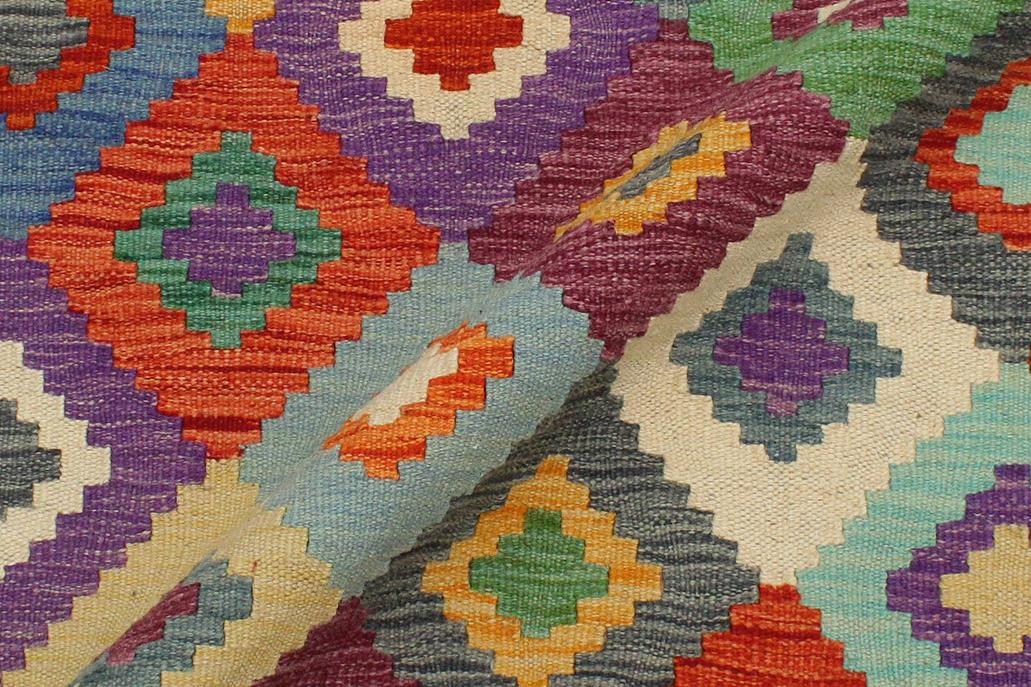 Elevate the elegance of your home with this stunning hand-woven tribal Kilim wool rug. Meticulously crafted on a loom by the Nomad Turkman people using hand-spun wool and 100% natural vegetable dyes, these rugs are recognized for their repetitive geometric patterns, incorporating naturalistic floral and traditional designs. The contemporary fashion palette results in bold, sharp patterns that are incredibly versatile, as the pattern is the same on both sides. These reversible rugs feature a lighter shade on one side and brighter colors on the other, providing versatility according to preference. These unique rugs are made by knotting short strands of different colors onto the warps and securing them by tightly pressing the wefts. The designs are created by interweaving the various colored wefts and warps. Kilims are known for their exceptional durability and versatility, making them truly unique rugs.