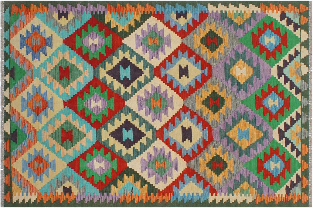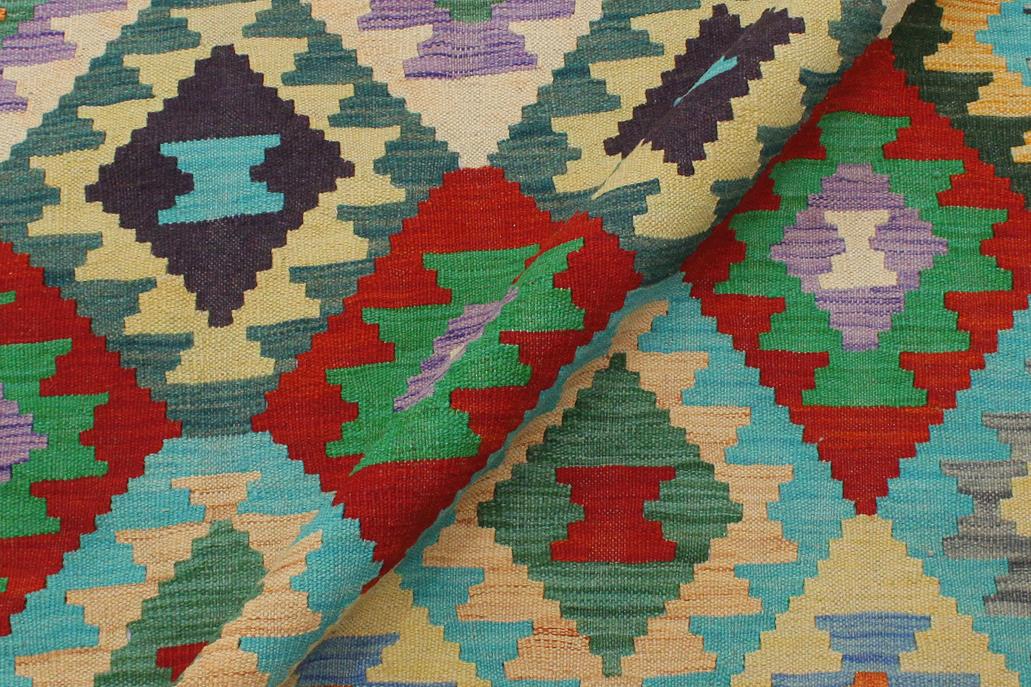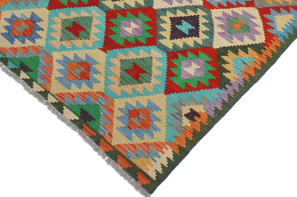 Elevate the elegance of your home with this stunning hand-woven tribal Kilim wool rug. Meticulously crafted on a loom by the Nomad Turkman people using hand-spun wool and 100% natural vegetable dyes, these rugs are recognized for their repetitive geometric patterns, incorporating naturalistic floral and traditional designs. The contemporary fashion palette results in bold, sharp patterns that are incredibly versatile, as the pattern is the same on both sides. These reversible rugs feature a lighter shade on one side and brighter colors on the other, providing versatility according to preference. These unique rugs are made by knotting short strands of different colors onto the warps and securing them by tightly pressing the wefts. The designs are created by interweaving the various colored wefts and warps. Kilims are known for their exceptional durability and versatility, making them truly unique rugs.