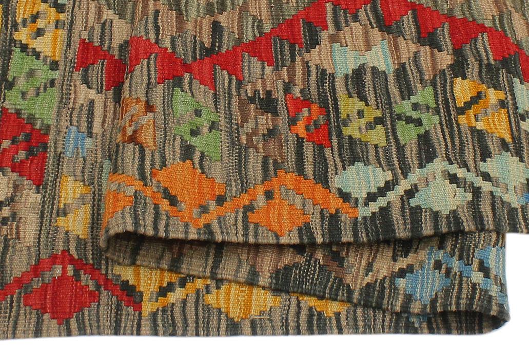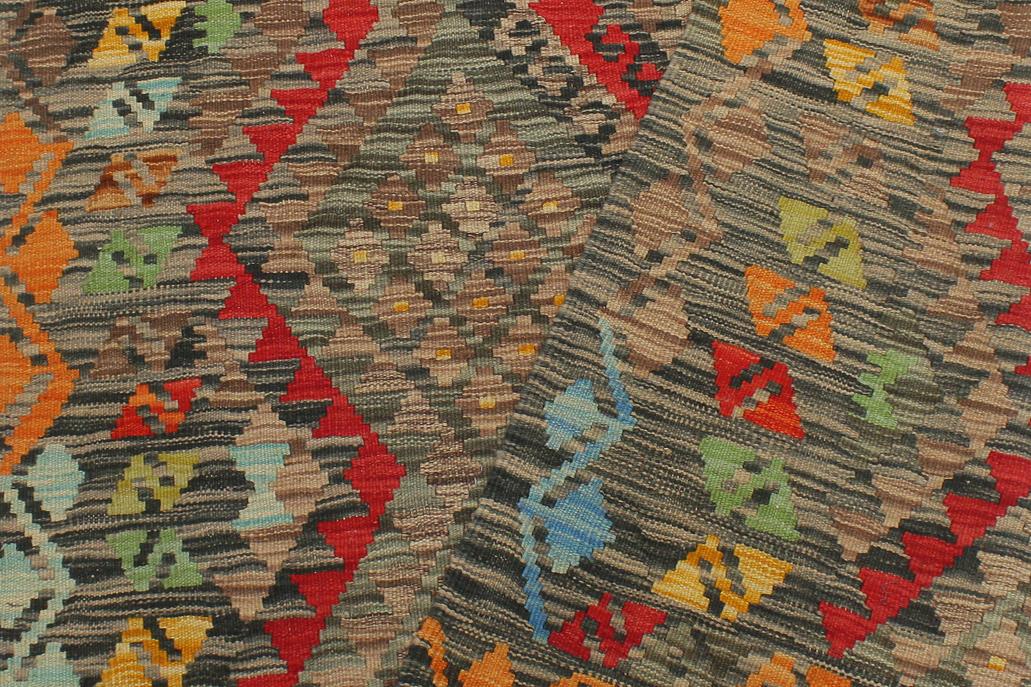 Elevate the elegance of your home with this stunning hand-woven tribal Kilim wool rug. Meticulously crafted on a loom by the Nomad Turkman people using hand-spun wool and 100% natural vegetable dyes, these rugs are recognized for their repetitive geometric patterns, incorporating naturalistic floral and traditional designs. The contemporary fashion palette results in bold, sharp patterns that are incredibly versatile, as the pattern is the same on both sides. These reversible rugs feature a lighter shade on one side and brighter colors on the other, providing versatility according to preference. These unique rugs are made by knotting short strands of different colors onto the warps and securing them by tightly pressing the wefts. The designs are created by interweaving the various colored wefts and warps. Kilims are known for their exceptional durability and versatility, making them truly unique rugs.