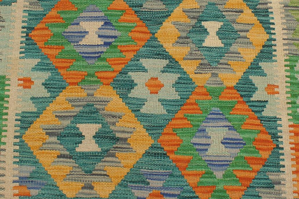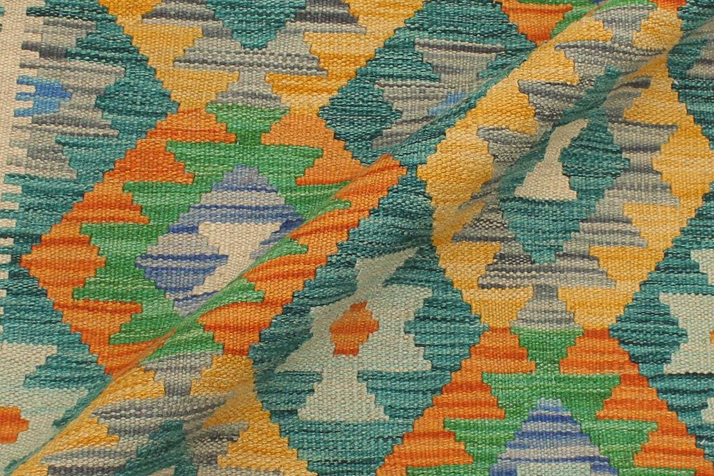 Elevate the elegance of your home with this stunning hand-woven tribal Kilim wool rug. Meticulously crafted on a loom by the Nomad Turkman people using hand-spun wool and 100% natural vegetable dyes, these rugs are recognized for their repetitive geometric patterns, incorporating naturalistic floral and traditional designs. The contemporary fashion palette results in bold, sharp patterns that are incredibly versatile, as the pattern is the same on both sides. These reversible rugs feature a lighter shade on one side and brighter colors on the other, providing versatility according to preference. These unique rugs are made by knotting short strands of different colors onto the warps and securing them by tightly pressing the wefts. The designs are created by interweaving the various colored wefts and warps. Kilims are known for their exceptional durability and versatility, making them truly unique rugs.