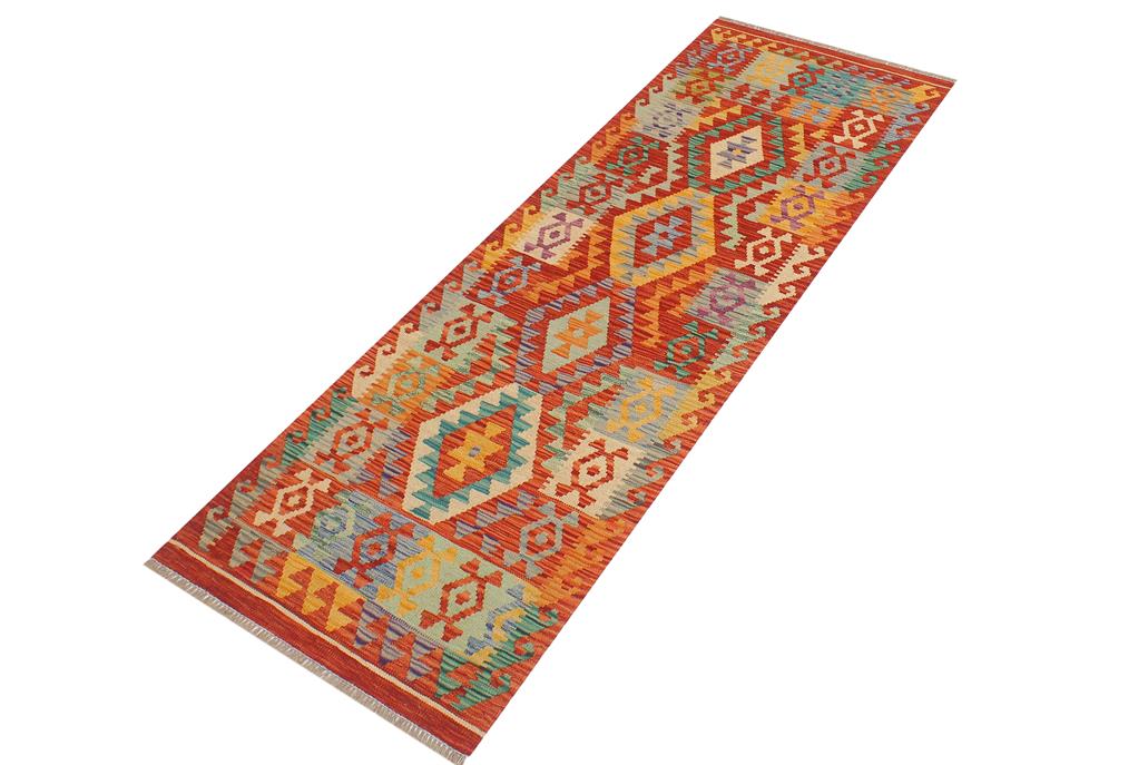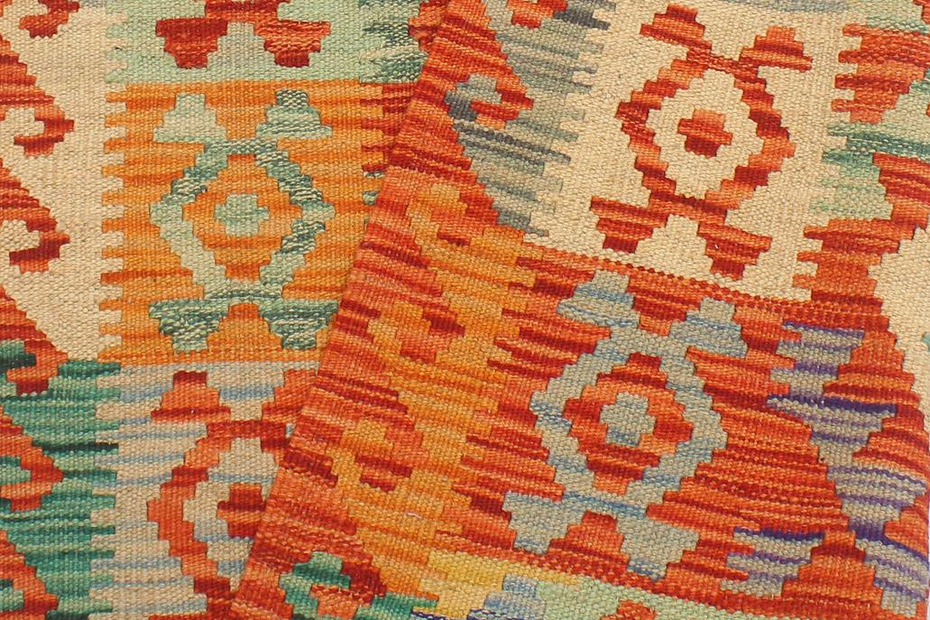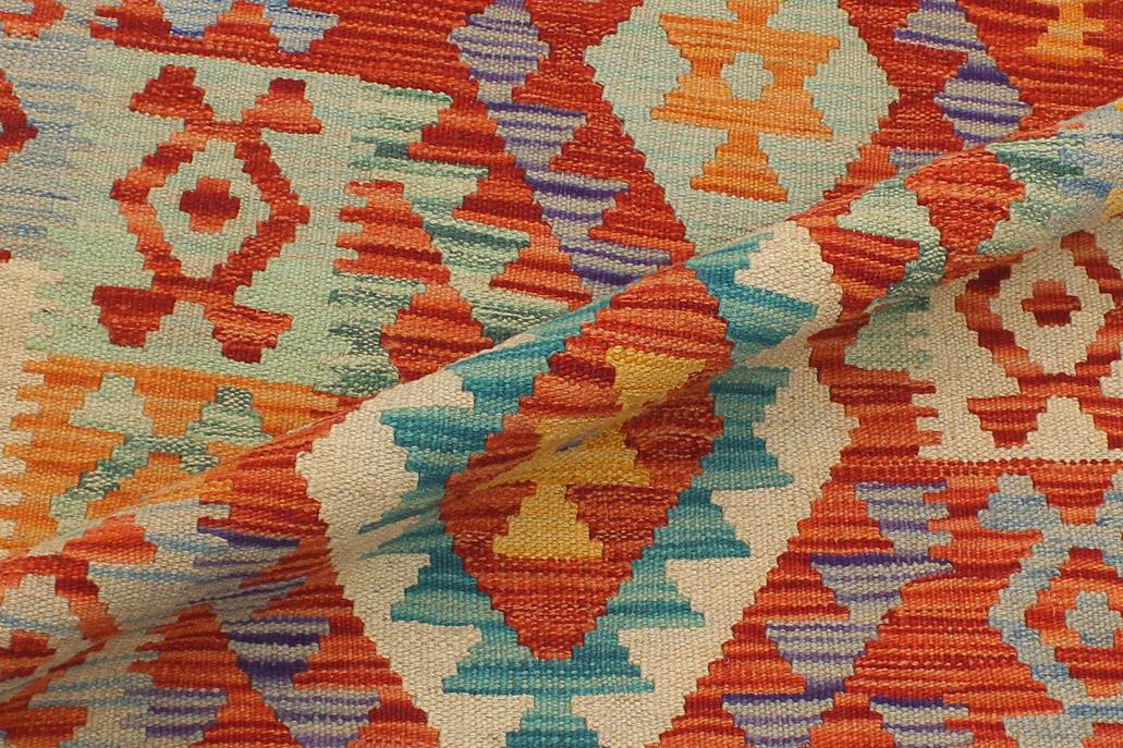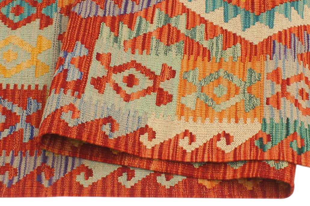Elevate the elegance of your home with this stunning hand-woven tribal Kilim wool rug. Meticulously crafted on a loom by the Nomad Turkman people using hand-spun wool and 100% natural vegetable dyes, these rugs are recognized for their repetitive geometric patterns, incorporating naturalistic floral and traditional designs. The contemporary fashion palette results in bold, sharp patterns that are incredibly versatile, as the pattern is the same on both sides. These reversible rugs feature a lighter shade on one side and brighter colors on the other, providing versatility according to preference. These unique rugs are made by knotting short strands of different colors onto the warps and securing them by tightly pressing the wefts. The designs are created by interweaving the various colored wefts and warps. Kilims are known for their exceptional durability and versatility, making them truly unique rugs.