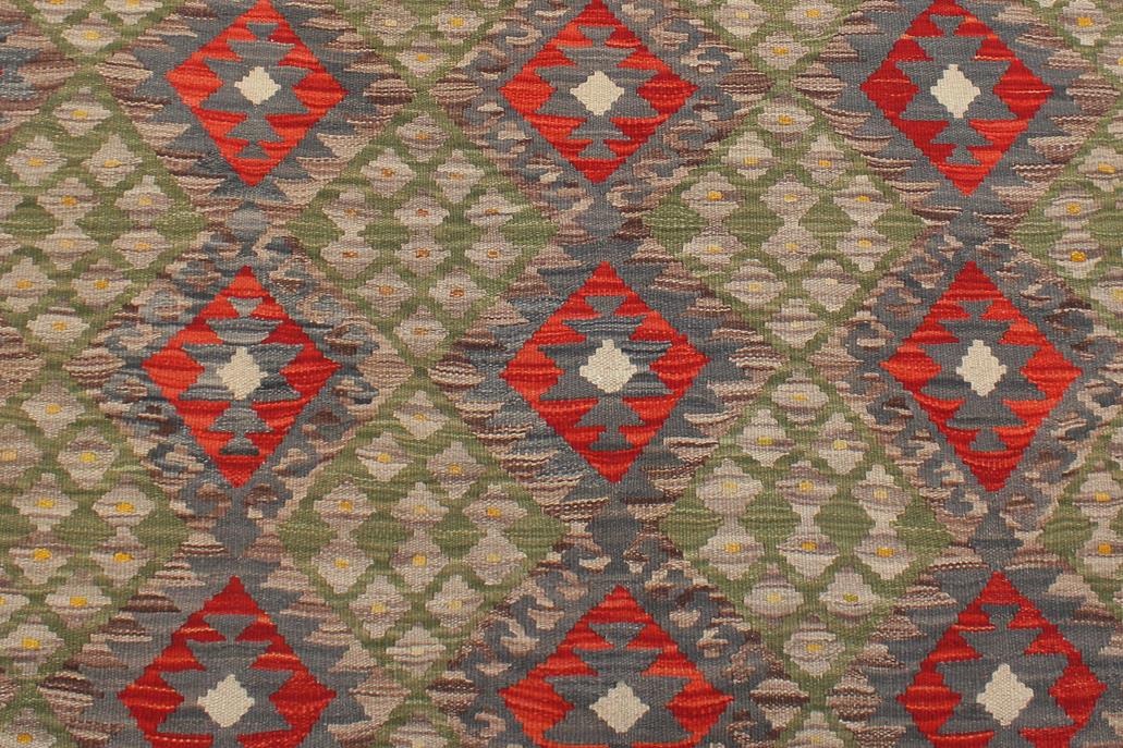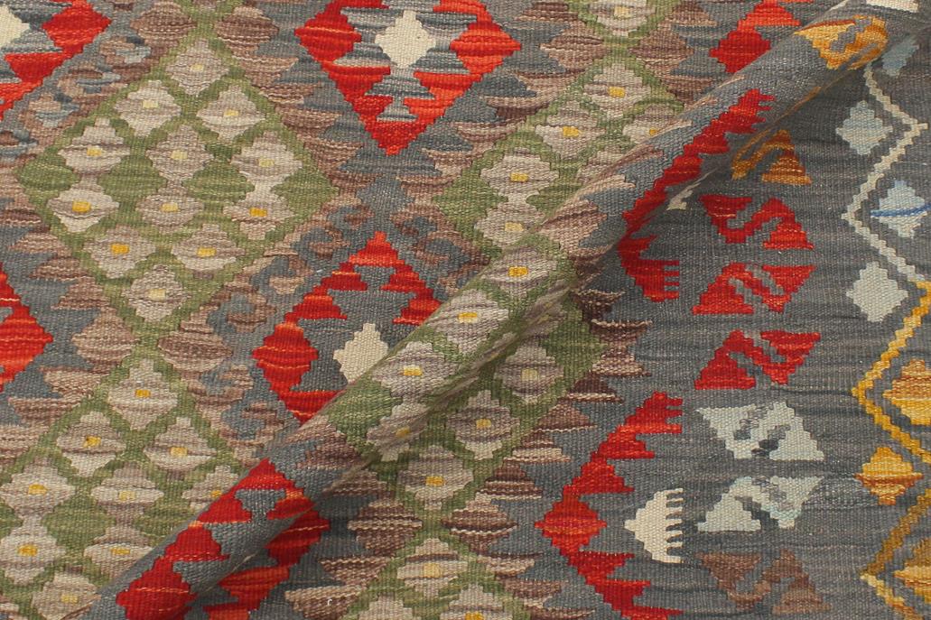 Elevate the elegance of your home with this stunning hand-woven tribal Kilim wool rug. Meticulously crafted on a loom by the Nomad Turkman people using hand-spun wool and 100% natural vegetable dyes, these rugs are recognized for their repetitive geometric patterns, incorporating naturalistic floral and traditional designs. The contemporary fashion palette results in bold, sharp patterns that are incredibly versatile, as the pattern is the same on both sides. These reversible rugs feature a lighter shade on one side and brighter colors on the other, providing versatility according to preference. These unique rugs are made by knotting short strands of different colors onto the warps and securing them by tightly pressing the wefts. The designs are created by interweaving the various colored wefts and warps. Kilims are known for their exceptional durability and versatility, making them truly unique rugs.