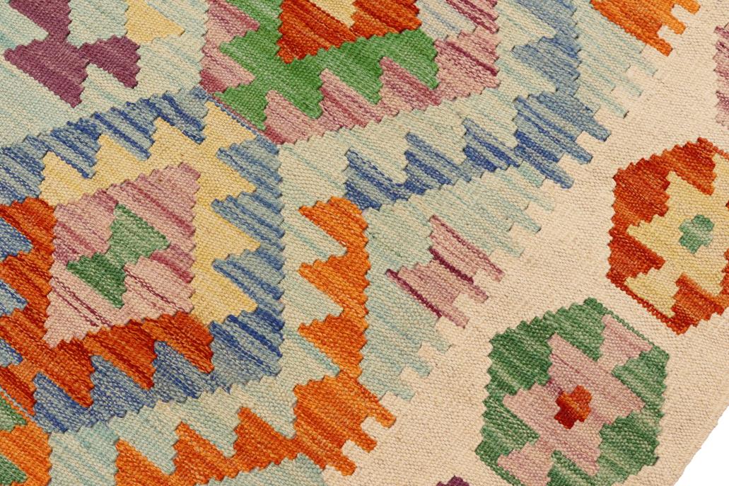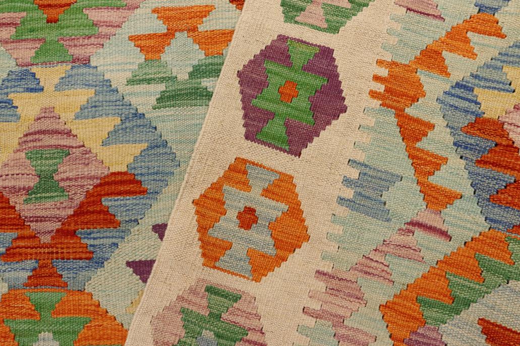 Elevate the elegance of your home with this stunning hand-woven tribal Kilim wool rug. Meticulously crafted on a loom by the Nomad Turkman people using hand-spun wool and 100% natural vegetable dyes, these rugs are recognized for their repetitive geometric patterns, incorporating naturalistic floral and traditional designs. The contemporary fashion palette results in bold, sharp patterns that are incredibly versatile, as the pattern is the same on both sides. These reversible rugs feature a lighter shade on one side and brighter colors on the other, providing versatility according to preference. These unique rugs are made by knotting short strands of different colors onto the warps and securing them by tightly pressing the wefts. The designs are created by interweaving the various colored wefts and warps. Kilims are known for their exceptional durability and versatility, making them truly unique rugs.