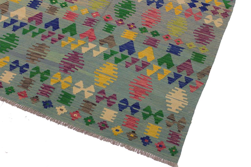 Elevate the elegance of your home with this stunning hand-woven tribal Kilim wool rug. Meticulously crafted on a loom by the Nomad Turkman people using hand-spun wool and 100% natural vegetable dyes, these rugs are recognized for their repetitive geometric patterns, incorporating naturalistic floral and traditional designs. The contemporary fashion palette results in bold, sharp patterns that are incredibly versatile, as the pattern is the same on both sides. These reversible rugs feature a lighter shade on one side and brighter colors on the other, providing versatility according to preference. These unique rugs are made by knotting short strands of different colors onto the warps and securing them by tightly pressing the wefts. The designs are created by interweaving the various colored wefts and warps. Kilims are known for their exceptional durability and versatility, making them truly unique rugs.