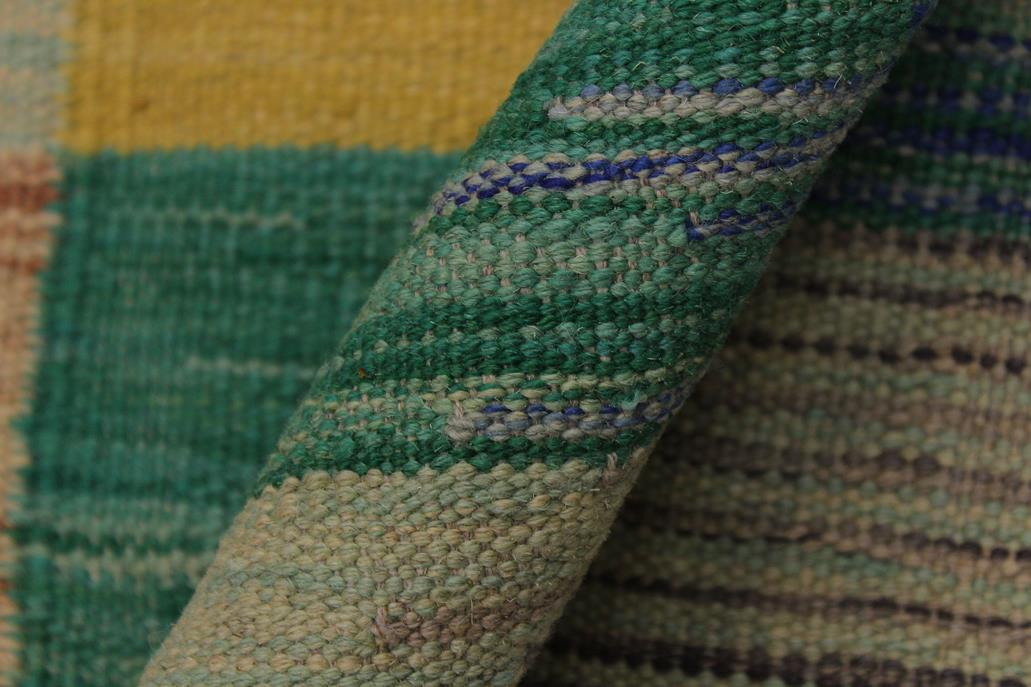 Elevate the elegance of your home with this stunning hand-woven tribal Kilim wool rug. Meticulously crafted on a loom by the Nomad Turkman people using hand-spun wool and 100% natural vegetable dyes, these rugs are recognized for their repetitive geometric patterns, incorporating naturalistic floral and traditional designs. The contemporary fashion palette results in bold, sharp patterns that are incredibly versatile, as the pattern is the same on both sides. These reversible rugs feature a lighter shade on one side and brighter colors on the other, providing versatility according to preference. These unique rugs are made by knotting short strands of different colors onto the warps and securing them by tightly pressing the wefts. The designs are created by interweaving the various colored wefts and warps. Kilims are known for their exceptional durability and versatility, making them truly unique rugs.