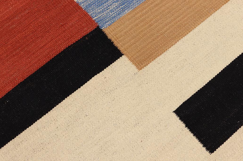 Elevate the elegance of your home with this stunning hand-woven tribal Kilim wool rug. Meticulously crafted on a loom by the Nomad Turkman people using hand-spun wool and 100% natural vegetable dyes, these rugs are recognized for their repetitive geometric patterns, incorporating naturalistic floral and traditional designs. The contemporary fashion palette results in bold, sharp patterns that are incredibly versatile, as the pattern is the same on both sides. These reversible rugs feature a lighter shade on one side and brighter colors on the other, providing versatility according to preference. These unique rugs are made by knotting short strands of different colors onto the warps and securing them by tightly pressing the wefts. The designs are created by interweaving the various colored wefts and warps. Kilims are known for their exceptional durability and versatility, making them truly unique rugs.