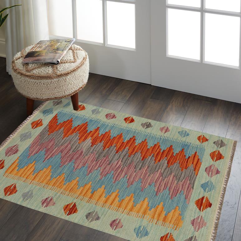 Elevate the elegance of your home with this stunning hand-woven tribal Kilim wool rug. Meticulously crafted on a loom by the Nomad Turkman people using hand-spun wool and 100% natural vegetable dyes, these rugs are recognized for their repetitive geometric patterns, incorporating naturalistic floral and traditional designs. The contemporary fashion palette results in bold, sharp patterns that are incredibly versatile, as the pattern is the same on both sides. These reversible rugs feature a lighter shade on one side and brighter colors on the other, providing versatility according to preference. These unique rugs are made by knotting short strands of different colors onto the warps and securing them by tightly pressing the wefts. The designs are created by interweaving the various colored wefts and warps. Kilims are known for their exceptional durability and versatility, making them truly unique rugs.