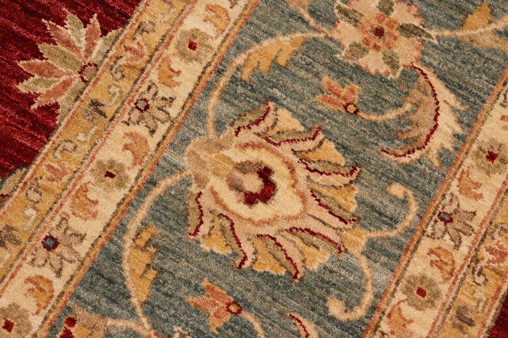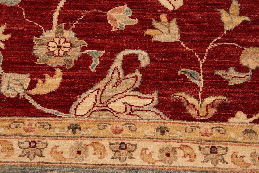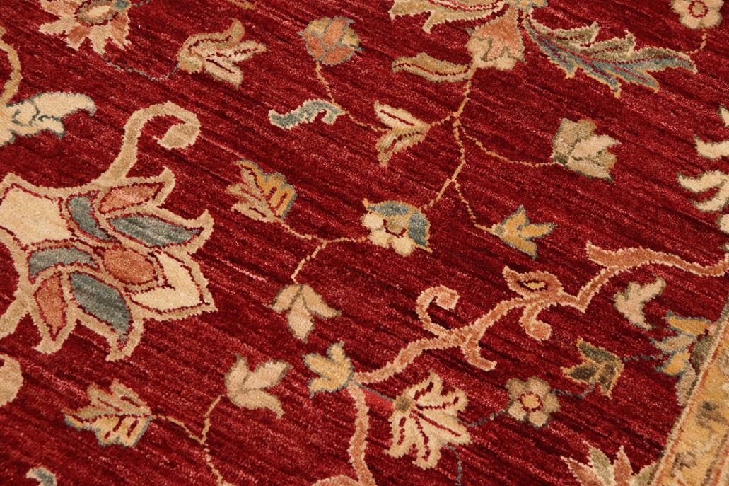 Enhance the ambiance of your home with this magnificent Persian-influenced Turkish hand-knotted rug made by skilled artisans capable of creating the most exceptional vegetable dyes and hand-spun wool. This exquisite handmade rug is a one-of-a-kind Peshawar Kafkaz, otherwise identified as Chobi, Chobi Peshawar, Oushak, or Ziegler rug. These handmade rugs are crafted in Pakistan utilizing superior-quality wool imported from Australia, New Zealand, and Korea in two types of weaves: the Persian weave and the Mori weave. This rug is meticulously crafted by hand using the finest natural vegetable dyes extracted from local plants. The artisans use a blend of hand-spun local and fine merino wool, resulting in a rug with a compelling texture, higher lanolin content, and longer staple. The artisans occasionally incorporate natural or artificial silk into the pile to enhance specific motifs. The finished product is an awe-inspiring execution of flawless design and an understated palette that exudes elegance. Contemporary Peshawar rugs draw inspiration from antique Persian designs and feature modern design motifs with vibrant color tones. Hand-knotted with all-natural dyes, resulting in a unique abrash effect and subtle color variations in the pile. Peshawar rugs are known for their stunning and vibrant colors, achieved through a process inspired by antique methods. The rug's pile is meticulously trimmed to a moderate thickness and then stone-washed and sun-dried, resulting in a natural sheen and pleasing color tones. Transform the ambiance of your room into a luxurious haven with this gorgeous rug featuring a beautiful color palette. This stunning rug features an intricate oriental design that showcases royalty and seamlessly complements any decor. Its hand-knotted construction and natural fibers provide a soft and comfortable feel underfoot, making it the perfect addition to any room.