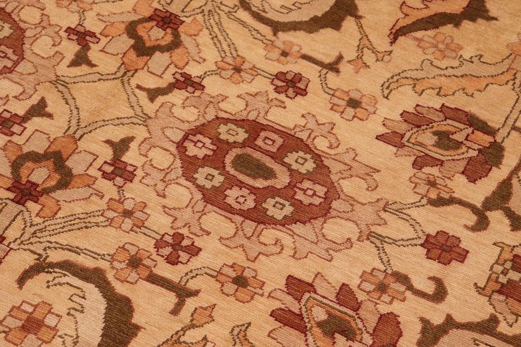 Enhance the ambiance of your home with this magnificent Persian-influenced Turkish hand-knotted rug made by skilled artisans capable of creating the most exceptional vegetable dyes and hand-spun wool. This exquisite handmade rug is a one-of-a-kind Peshawar Kafkaz, otherwise identified as Chobi, Chobi Peshawar, Oushak, or Ziegler rug. These handmade rugs are crafted in Pakistan utilizing superior-quality wool imported from Australia, New Zealand, and Korea in two types of weaves: the Persian weave and the Mori weave. This rug is meticulously crafted by hand using the finest natural vegetable dyes extracted from local plants. The artisans use a blend of hand-spun local and fine merino wool, resulting in a rug with a compelling texture, higher lanolin content, and longer staple. The artisans occasionally incorporate natural or artificial silk into the pile to enhance specific motifs. The finished product is an awe-inspiring execution of flawless design and an understated palette that exudes elegance. Contemporary Peshawar rugs draw inspiration from antique Persian designs and feature modern design motifs with vibrant color tones. Hand-knotted with all-natural dyes, resulting in a unique abrash effect and subtle color variations in the pile. Peshawar rugs are known for their stunning and vibrant colors, achieved through a process inspired by antique methods. The rug's pile is meticulously trimmed to a moderate thickness and then stone-washed and sun-dried, resulting in a natural sheen and pleasing color tones. Transform the ambiance of your room into a luxurious haven with this gorgeous rug featuring a beautiful color palette. This stunning rug features an intricate oriental design that showcases royalty and seamlessly complements any decor. Its hand-knotted construction and natural fibers provide a soft and comfortable feel underfoot, making it the perfect addition to any room.