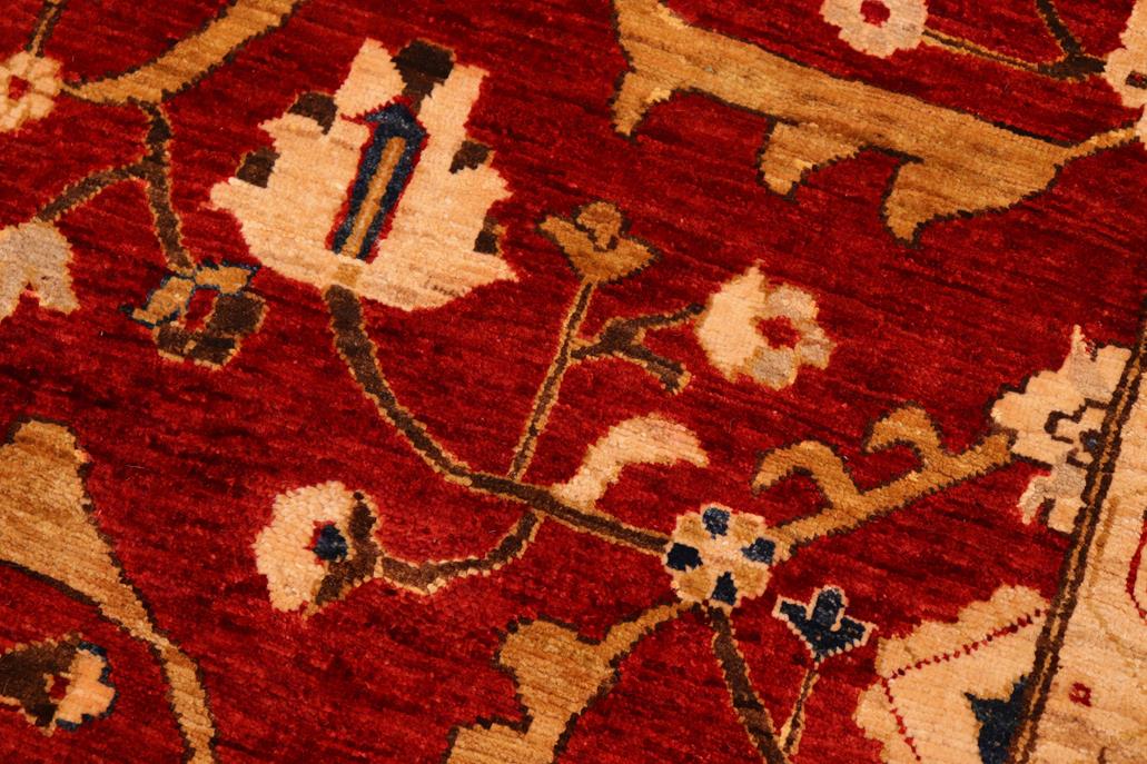 Enhance the ambiance of your home with this magnificent Persian-influenced Turkish hand-knotted rug made by skilled artisans capable of creating the most exceptional vegetable dyes and hand-spun wool. This exquisite handmade rug is a one-of-a-kind Peshawar Kafkaz, otherwise identified as Chobi, Chobi Peshawar, Oushak, or Ziegler rug. These handmade rugs are crafted in Pakistan utilizing superior-quality wool imported from Australia, New Zealand, and Korea in two types of weaves: the Persian weave and the Mori weave. This rug is meticulously crafted by hand using the finest natural vegetable dyes extracted from local plants. The artisans use a blend of hand-spun local and fine merino wool, resulting in a rug with a compelling texture, higher lanolin content, and longer staple. The artisans occasionally incorporate natural or artificial silk into the pile to enhance specific motifs. The finished product is an awe-inspiring execution of flawless design and an understated palette that exudes elegance. Contemporary Peshawar rugs draw inspiration from antique Persian designs and feature modern design motifs with vibrant color tones. Hand-knotted with all-natural dyes, resulting in a unique abrash effect and subtle color variations in the pile. Peshawar rugs are known for their stunning and vibrant colors, achieved through a process inspired by antique methods. The rug's pile is meticulously trimmed to a moderate thickness and then stone-washed and sun-dried, resulting in a natural sheen and pleasing color tones. Transform the ambiance of your room into a luxurious haven with this gorgeous rug featuring a beautiful color palette. This stunning rug features an intricate oriental design that showcases royalty and seamlessly complements any decor. Its hand-knotted construction and natural fibers provide a soft and comfortable feel underfoot, making it the perfect addition to any room.