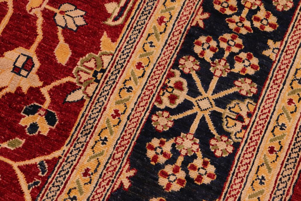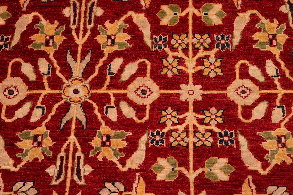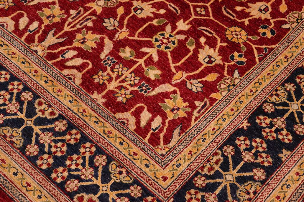 Enhance the ambiance of your home with this magnificent Persian-influenced Turkish hand-knotted rug made by skilled artisans capable of creating the most exceptional vegetable dyes and hand-spun wool. This exquisite handmade rug is a one-of-a-kind Peshawar Kafkaz, otherwise identified as Chobi, Chobi Peshawar, Oushak, or Ziegler rug. These handmade rugs are crafted in Pakistan utilizing superior-quality wool imported from Australia, New Zealand, and Korea in two types of weaves: the Persian weave and the Mori weave. This rug is meticulously crafted by hand using the finest natural vegetable dyes extracted from local plants. The artisans use a blend of hand-spun local and fine merino wool, resulting in a rug with a compelling texture, higher lanolin content, and longer staple. The artisans occasionally incorporate natural or artificial silk into the pile to enhance specific motifs. The finished product is an awe-inspiring execution of flawless design and an understated palette that exudes elegance. Contemporary Peshawar rugs draw inspiration from antique Persian designs and feature modern design motifs with vibrant color tones. Hand-knotted with all-natural dyes, resulting in a unique abrash effect and subtle color variations in the pile. Peshawar rugs are known for their stunning and vibrant colors, achieved through a process inspired by antique methods. The rug's pile is meticulously trimmed to a moderate thickness and then stone-washed and sun-dried, resulting in a natural sheen and pleasing color tones. Transform the ambiance of your room into a luxurious haven with this gorgeous rug featuring a beautiful color palette. This stunning rug features an intricate oriental design that showcases royalty and seamlessly complements any decor. Its hand-knotted construction and natural fibers provide a soft and comfortable feel underfoot, making it the perfect addition to any room.