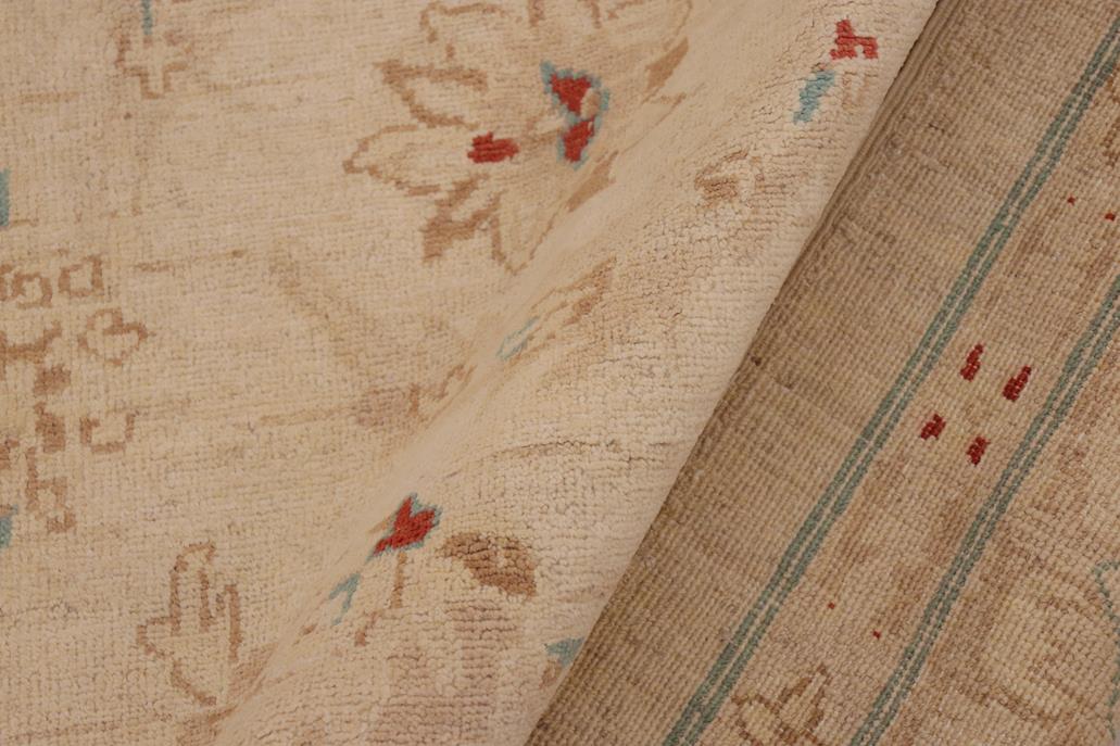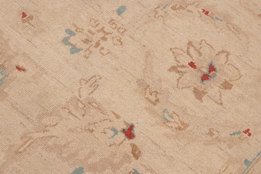 Enhance the ambiance of your home with this magnificent Persian-influenced Turkish hand-knotted rug made by skilled artisans capable of creating the most exceptional vegetable dyes and hand-spun wool. This exquisite handmade rug is a one-of-a-kind Peshawar Kafkaz, otherwise identified as Chobi, Chobi Peshawar, Oushak, or Ziegler rug. These handmade rugs are crafted in Pakistan utilizing superior-quality wool imported from Australia, New Zealand, and Korea in two types of weaves: the Persian weave and the Mori weave. This rug is meticulously crafted by hand using the finest natural vegetable dyes extracted from local plants. The artisans use a blend of hand-spun local and fine merino wool, resulting in a rug with a compelling texture, higher lanolin content, and longer staple. The artisans occasionally incorporate natural or artificial silk into the pile to enhance specific motifs. The finished product is an awe-inspiring execution of flawless design and an understated palette that exudes elegance. Contemporary Peshawar rugs draw inspiration from antique Persian designs and feature modern design motifs with vibrant color tones. Hand-knotted with all-natural dyes, resulting in a unique abrash effect and subtle color variations in the pile. Peshawar rugs are known for their stunning and vibrant colors, achieved through a process inspired by antique methods. The rug's pile is meticulously trimmed to a moderate thickness and then stone-washed and sun-dried, resulting in a natural sheen and pleasing color tones. Transform the ambiance of your room into a luxurious haven with this gorgeous rug featuring a beautiful color palette. This stunning rug features an intricate oriental design that showcases royalty and seamlessly complements any decor. Its hand-knotted construction and natural fibers provide a soft and comfortable feel underfoot, making it the perfect addition to any room.