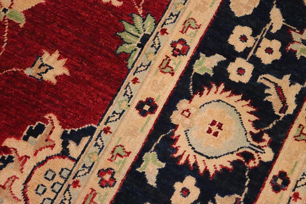 Enhance the ambiance of your home with this magnificent Persian-influenced Turkish hand-knotted rug made by skilled artisans capable of creating the most exceptional vegetable dyes and hand-spun wool. This exquisite handmade rug is a one-of-a-kind Peshawar Kafkaz, otherwise identified as Chobi, Chobi Peshawar, Oushak, or Ziegler rug. These handmade rugs are crafted in Pakistan utilizing superior-quality wool imported from Australia, New Zealand, and Korea in two types of weaves: the Persian weave and the Mori weave. This rug is meticulously crafted by hand using the finest natural vegetable dyes extracted from local plants. The artisans use a blend of hand-spun local and fine merino wool, resulting in a rug with a compelling texture, higher lanolin content, and longer staple. The artisans occasionally incorporate natural or artificial silk into the pile to enhance specific motifs. The finished product is an awe-inspiring execution of flawless design and an understated palette that exudes elegance. Contemporary Peshawar rugs draw inspiration from antique Persian designs and feature modern design motifs with vibrant color tones. Hand-knotted with all-natural dyes, resulting in a unique abrash effect and subtle color variations in the pile. Peshawar rugs are known for their stunning and vibrant colors, achieved through a process inspired by antique methods. The rug's pile is meticulously trimmed to a moderate thickness and then stone-washed and sun-dried, resulting in a natural sheen and pleasing color tones. Transform the ambiance of your room into a luxurious haven with this gorgeous rug featuring a beautiful color palette. This stunning rug features an intricate oriental design that showcases royalty and seamlessly complements any decor. Its hand-knotted construction and natural fibers provide a soft and comfortable feel underfoot, making it the perfect addition to any room.